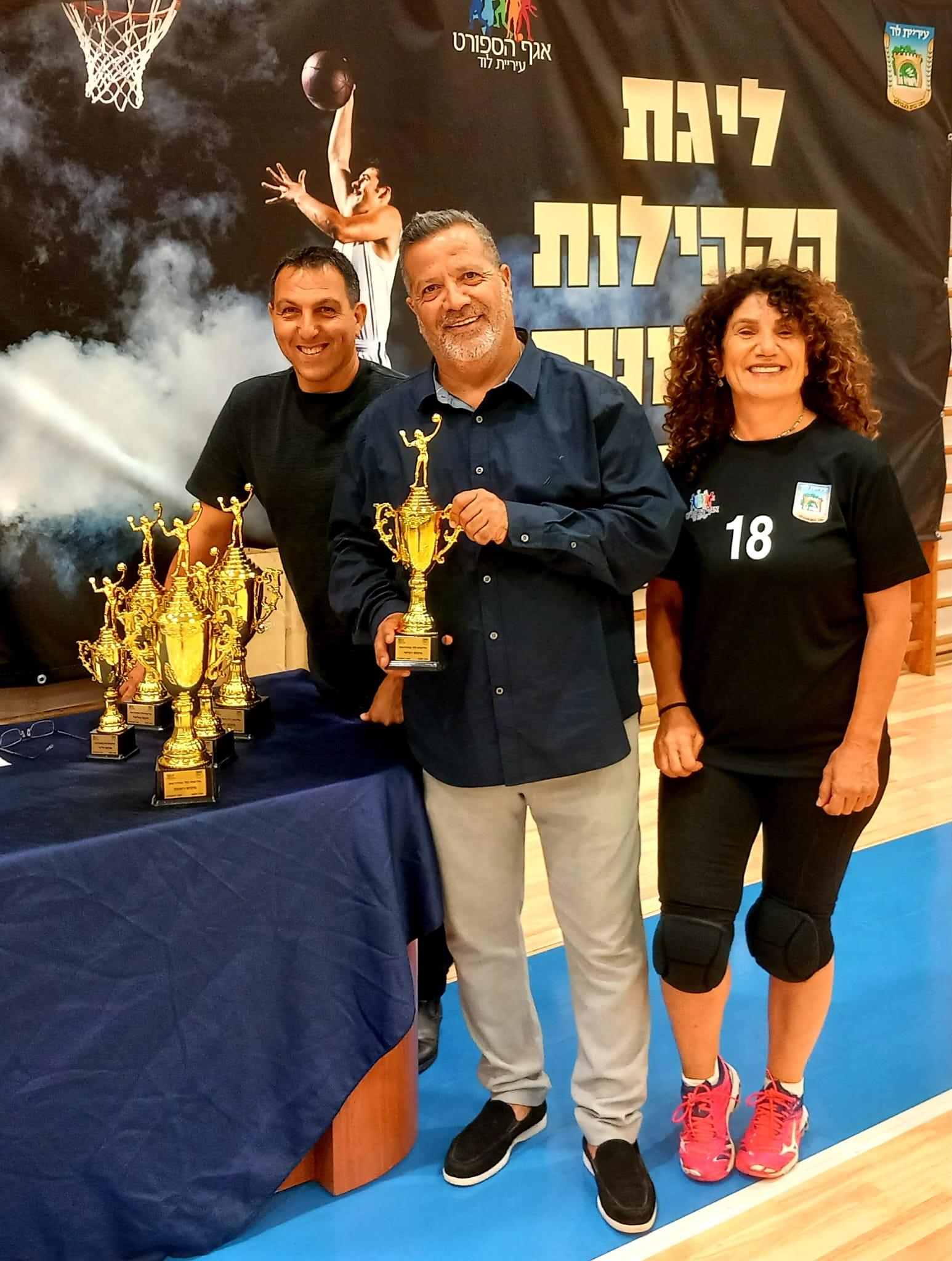 אריה לוי, ירון זרד ומזל קוקה טייב עם הגביעים שחולקו בטורניר הכדורשת
