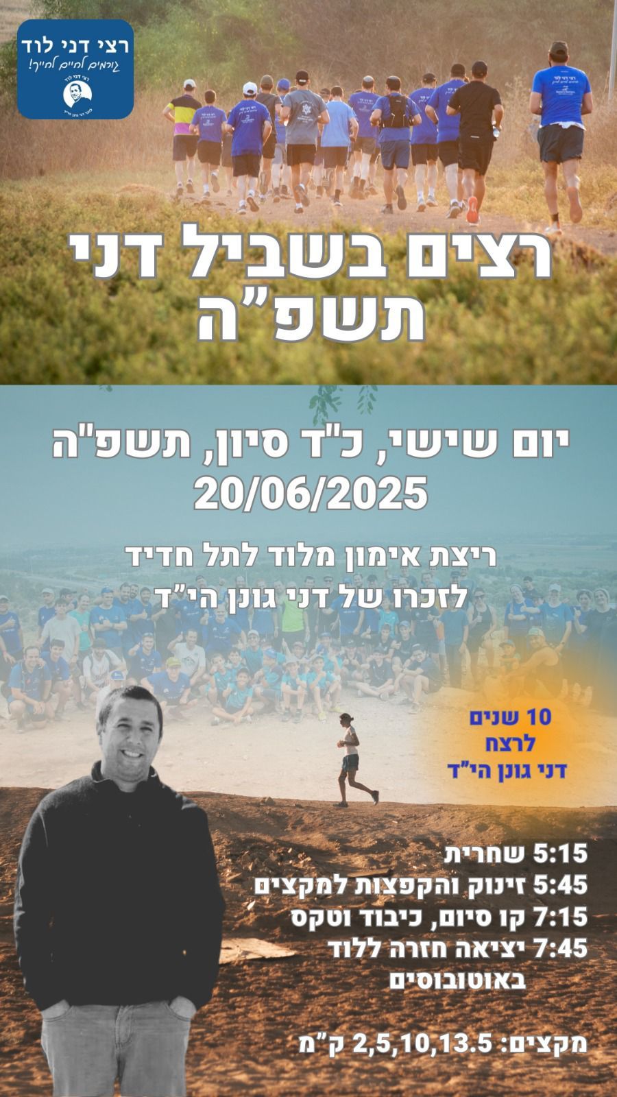 עשר שנים עברו, אבל הזיכרון חי וקיים – גם השנה יתקיים אימון הריצה החברתי "רצים בשביל דני", אירוע מסורתי לזכרו של דני גונן ז"ל, בהובלת קבוצת "רצי דני" והמאמן גלעד פולק. ריצה בשטח, באוויר הפתוח, המחברת בין קהילה, משפחות וספורטאים מכל הגילים, במסלול מרגש מלוד אל תל חדיד.