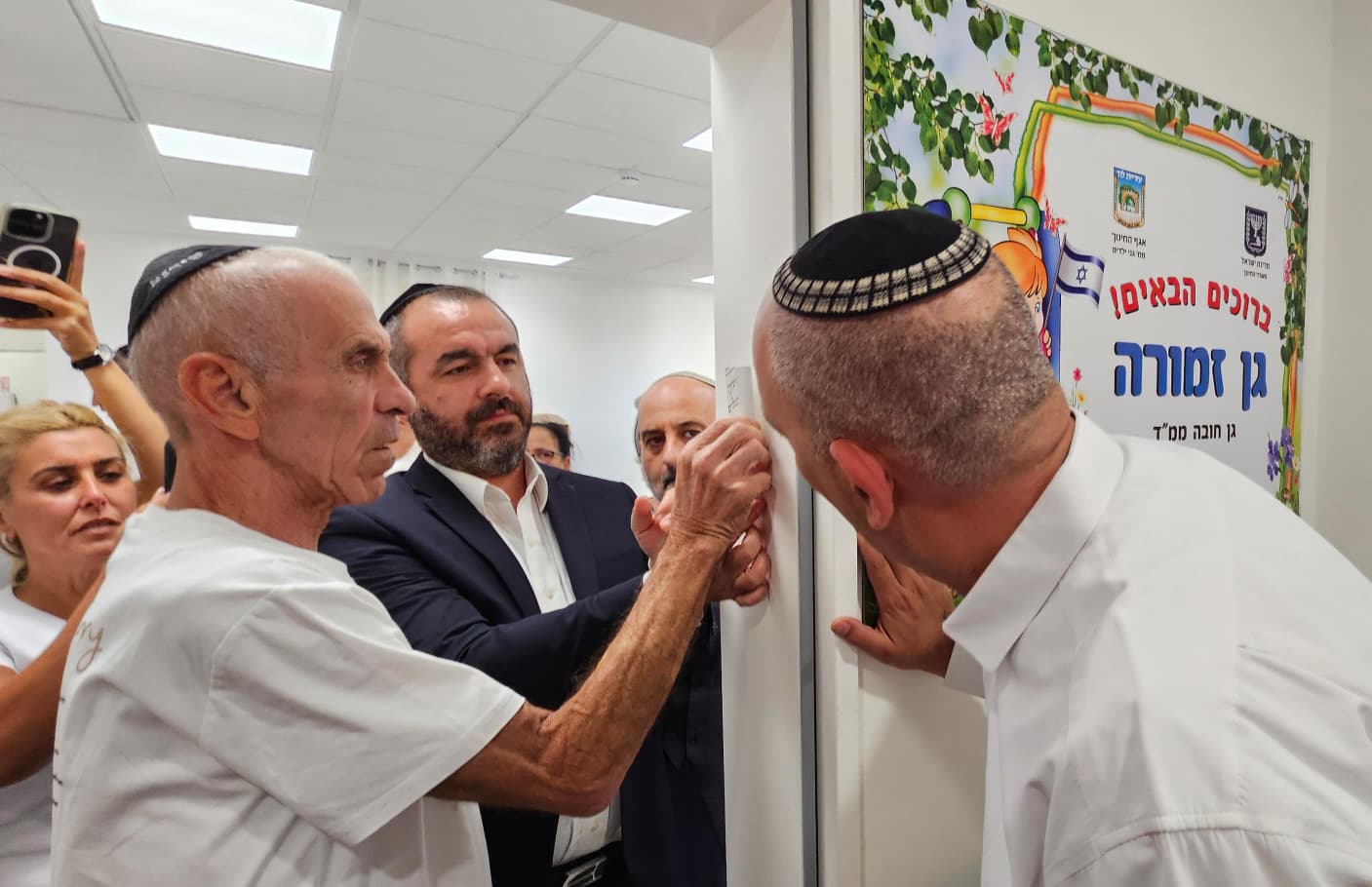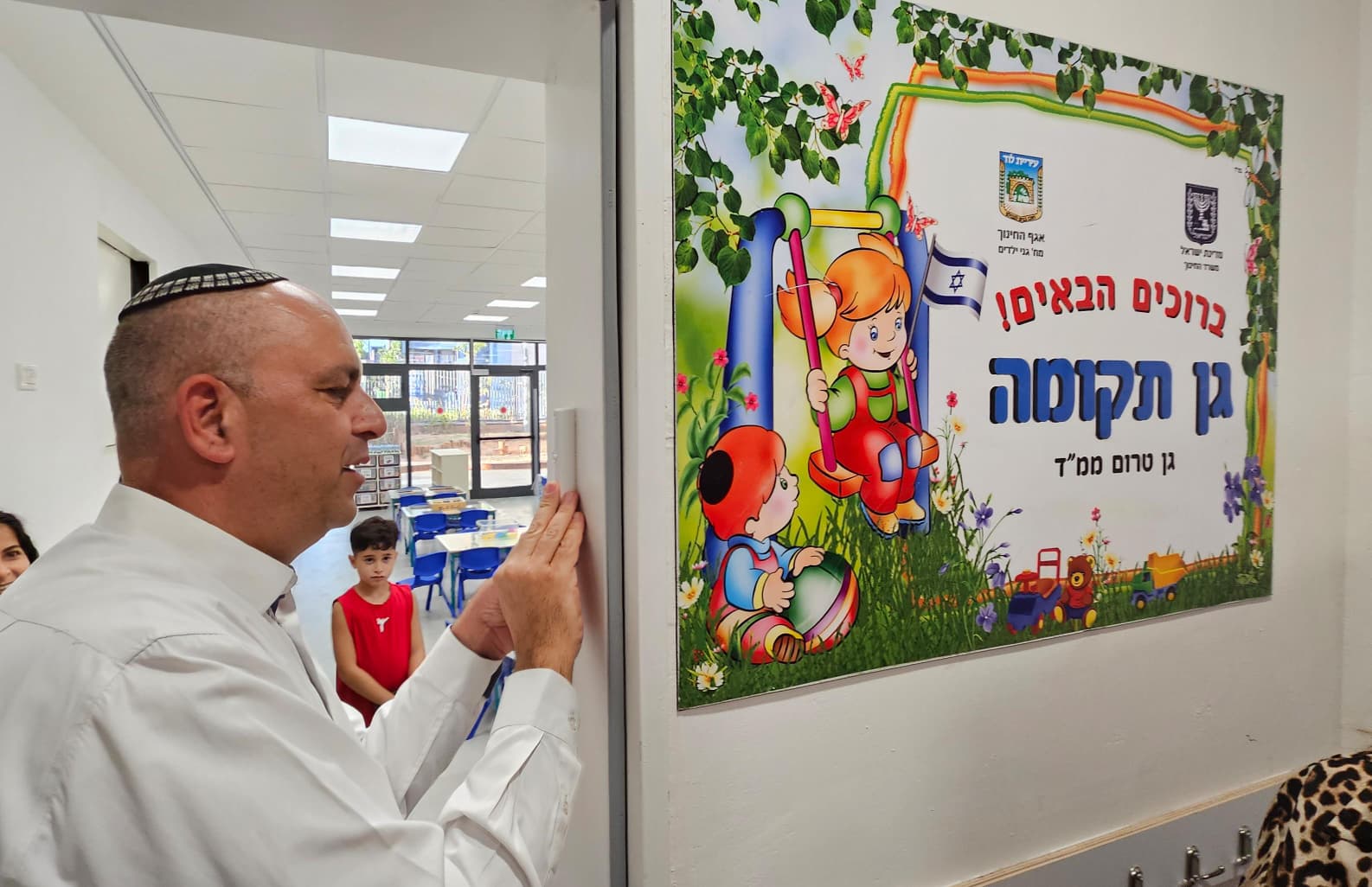 רביבו קובע מזוזה בפתח גן הילדים תקומה החדש בנופי בן שמן.jpe