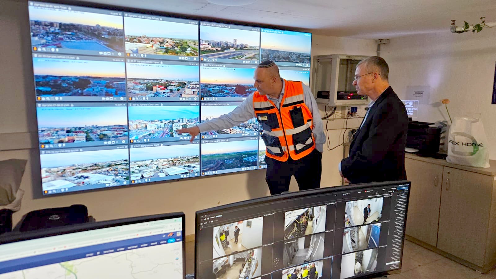 השר לוין מקבל סקירה על המוקד הרואה של עיריית לוד שמפעיל 1500 מצלמות.jpe
