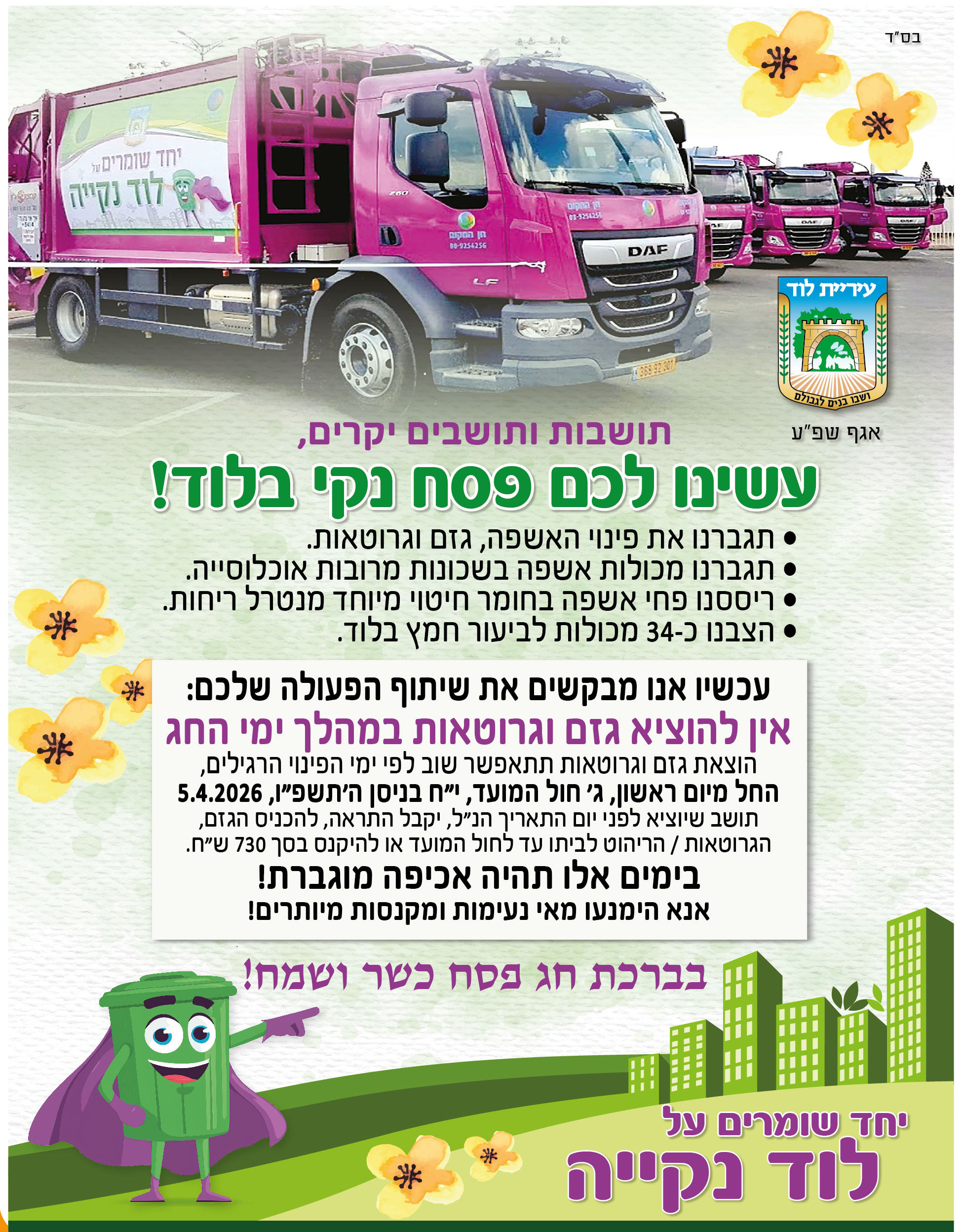 תושבות ותושבים יקרים, אנא הקפידו שלא להוציא גזם וגרוטאות במהלך ימי החג, וביחד נשמור על לוד נקייה, נעימה ומכבדת לקראת הפסח. חג כשר ושמח!