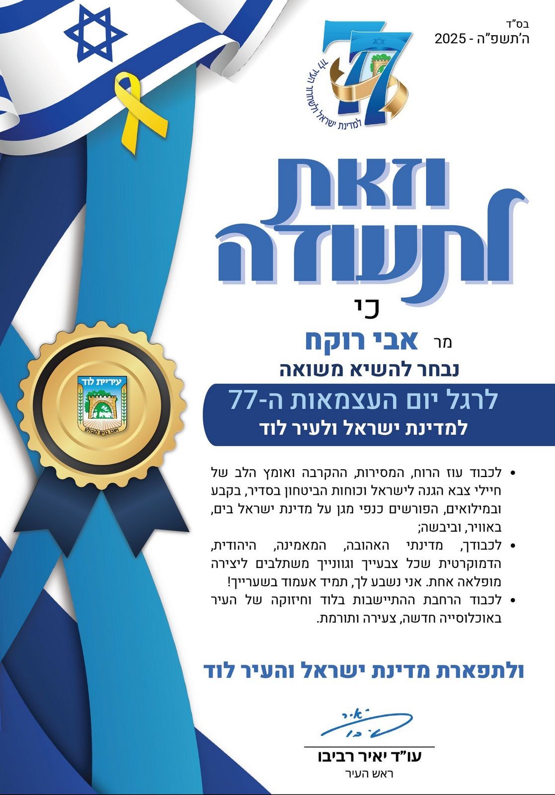 נבחר להשיא משואה ביום העצמאות ה-77 למדינת ישראל ולעיר לוד