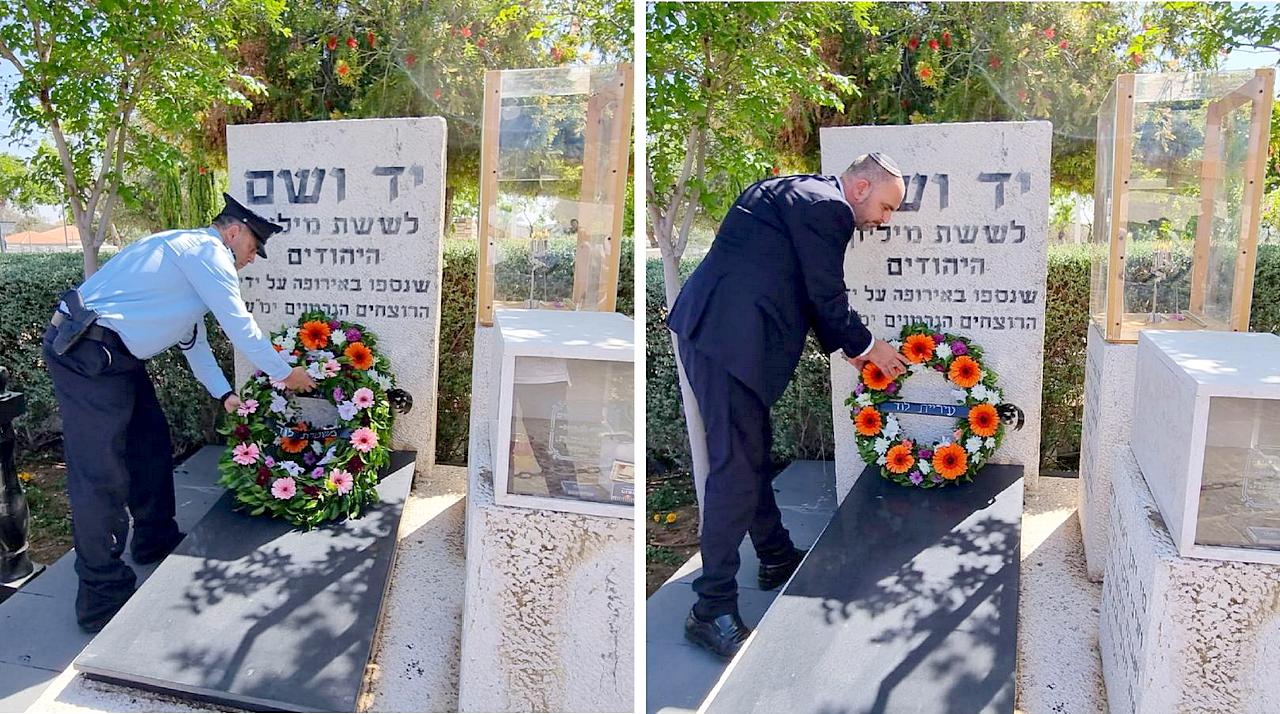 - הנחת זרים על אנדרטת השואה ע"י ראש העיר ומפקד התחנה