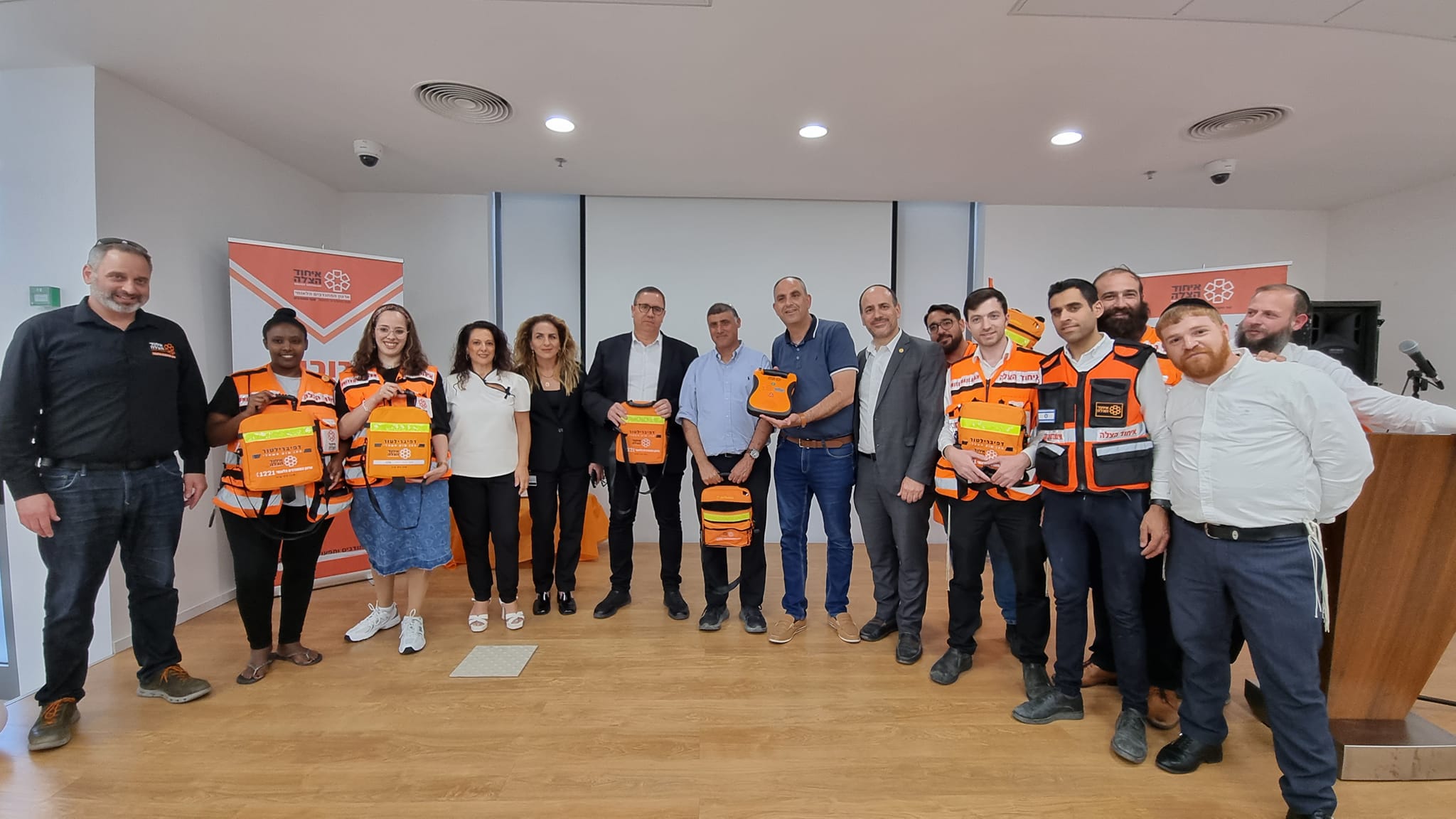 - יאיר רביבו וסגנו גיל חדד מעניקים מכשירי החייאה למתנדבים החדשים