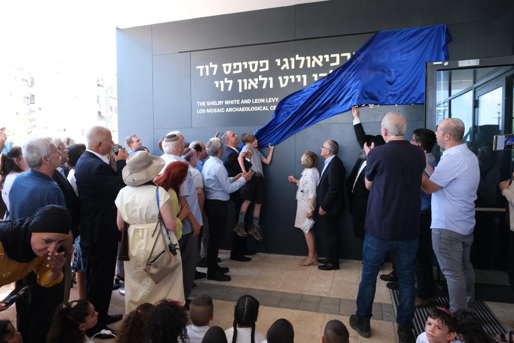 - מסירים את הלוט מעל שלט המרכז הארכיאולוגי פסיפס לוד עש שלבי וויט ולאון לוי