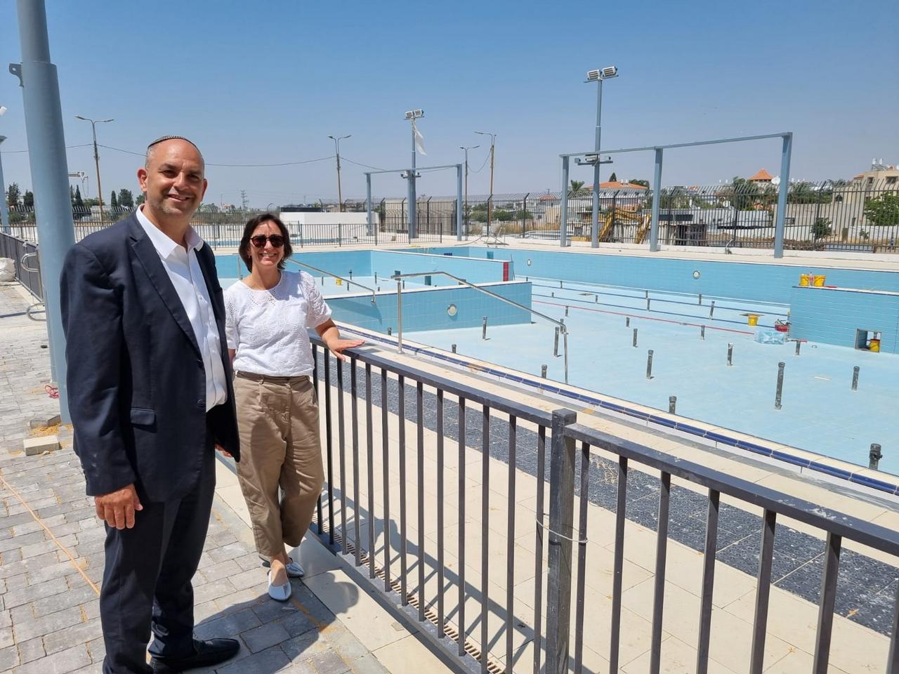 - בתמונה: ראש העיר ומהנדסת העיר עוקבים מקרוב אחר סיום העבודות בבריכת גני אביב