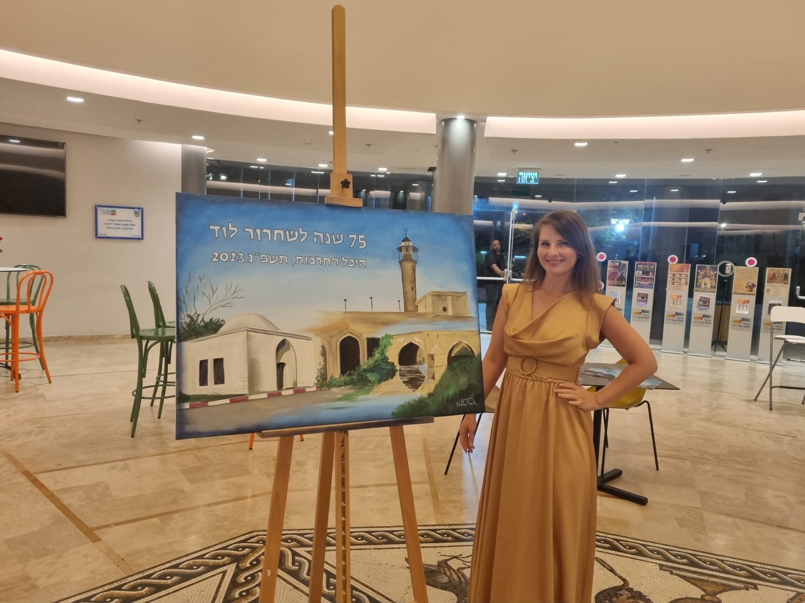 • הציירת נופר צוק בהיכל התרבות - עם הציור שהכינה לציון 75 שנה לשחרור לוד