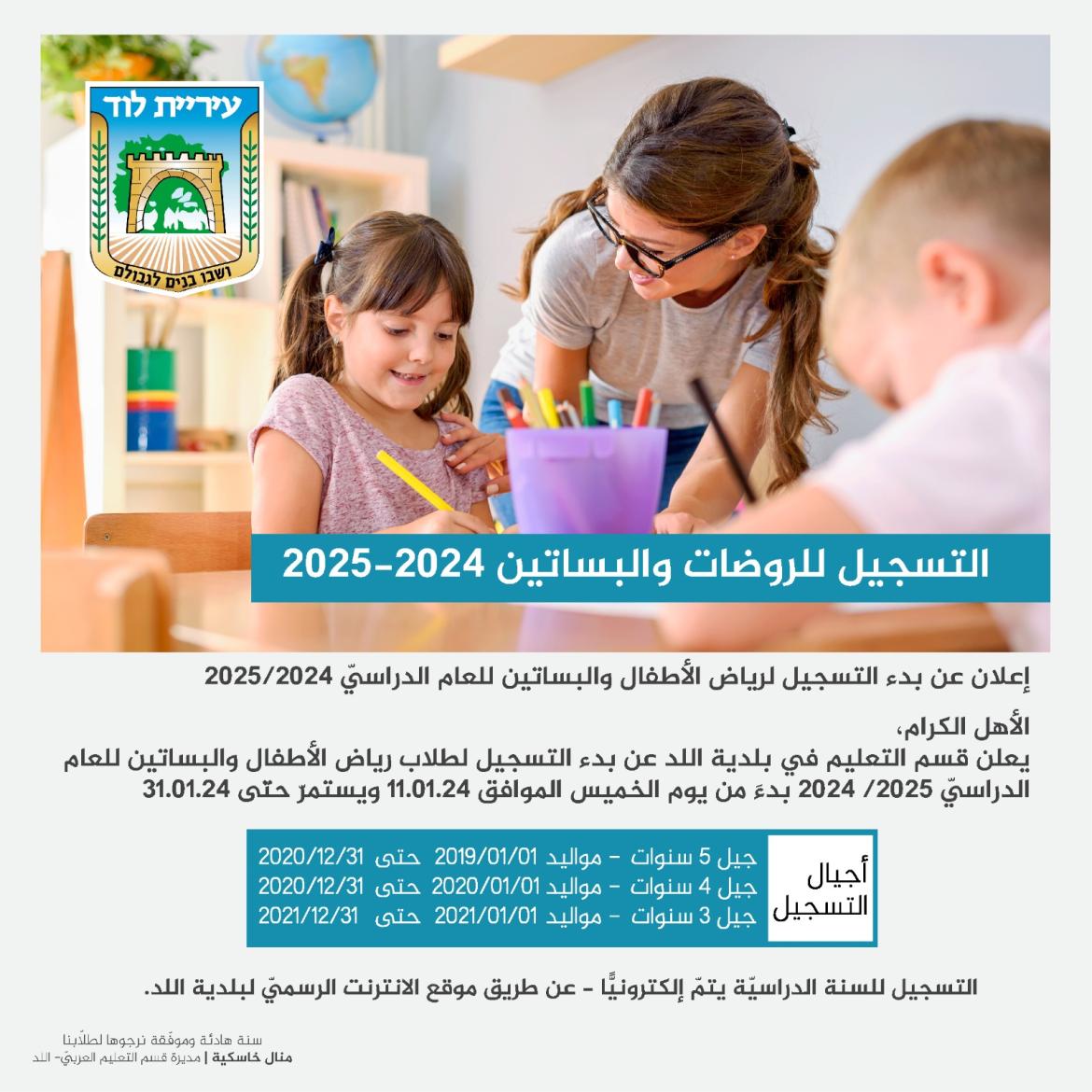 يعلن قسم التعليم في بلدية اللد عن بدء التسجيل لطلاب رياض الأطفال والبساتين للعام الدراسيّ 2026/ 2025 بدءَ من يوم الخميس الموافق 30.01.25 ويستمرّ حتّى 19.02.25