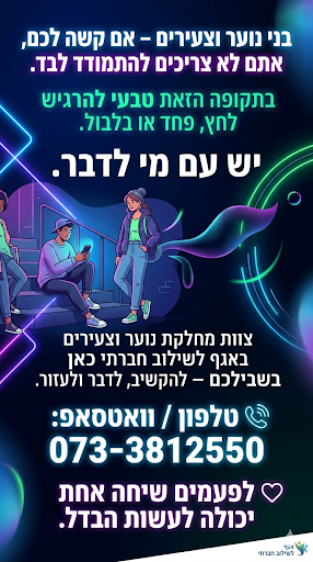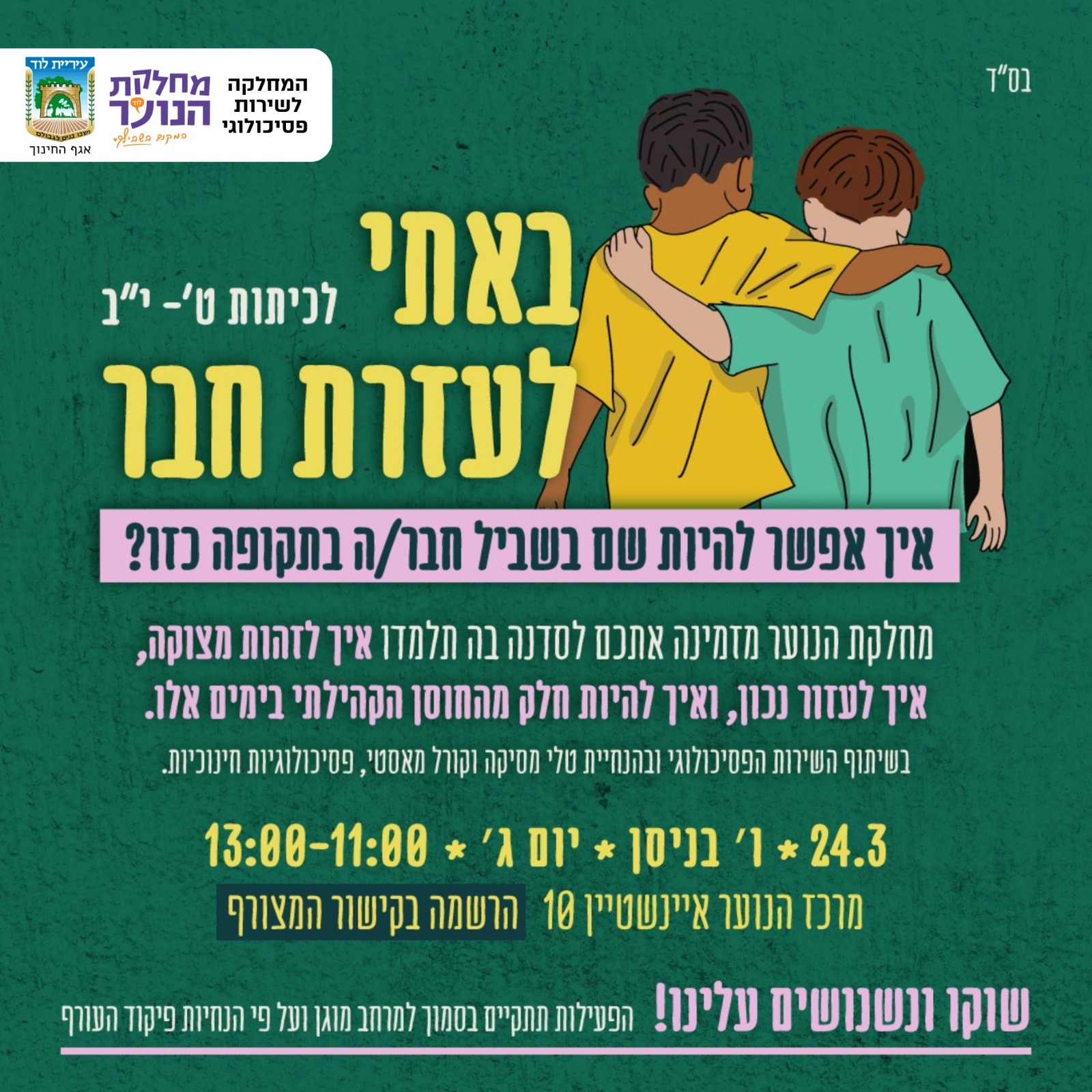 מחלקת הנוער, בשיתוף השירות הפסיכולוגי, מזמינה אתכם לסדנה מיוחדת, חשובה ומעשירה שבה נדבר על איך מזהים מצוקה, איך ניגשים נכון ואיך אפשר לעזור באמת.