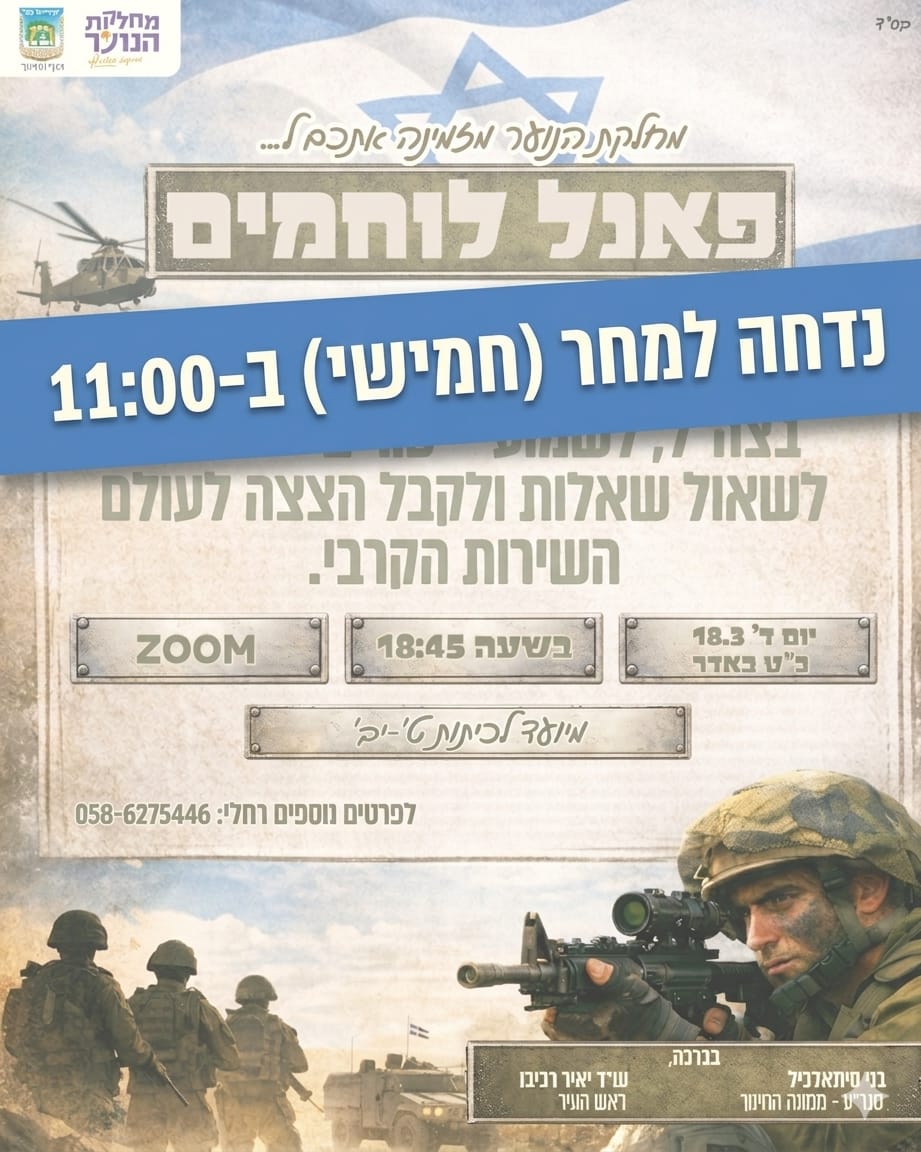 מחלקת הנוער מזמינה אתכם לפאנל עם הלוחמים הגיבורים שלנו, המשרתים במגוון יחידות בצה"ל.