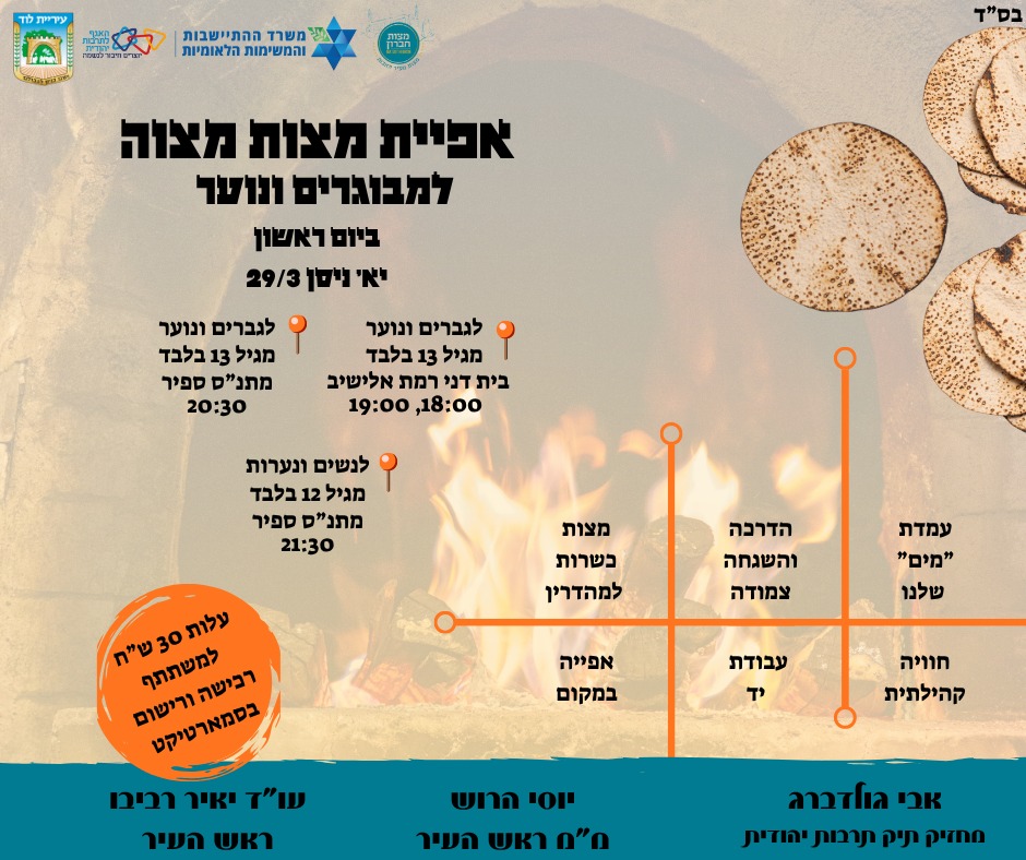 סדנת אפיית מצות מצוה - לגברים ונוער מגיל 13 בליווי מבוגר ברמת אלישיב - להרשמה