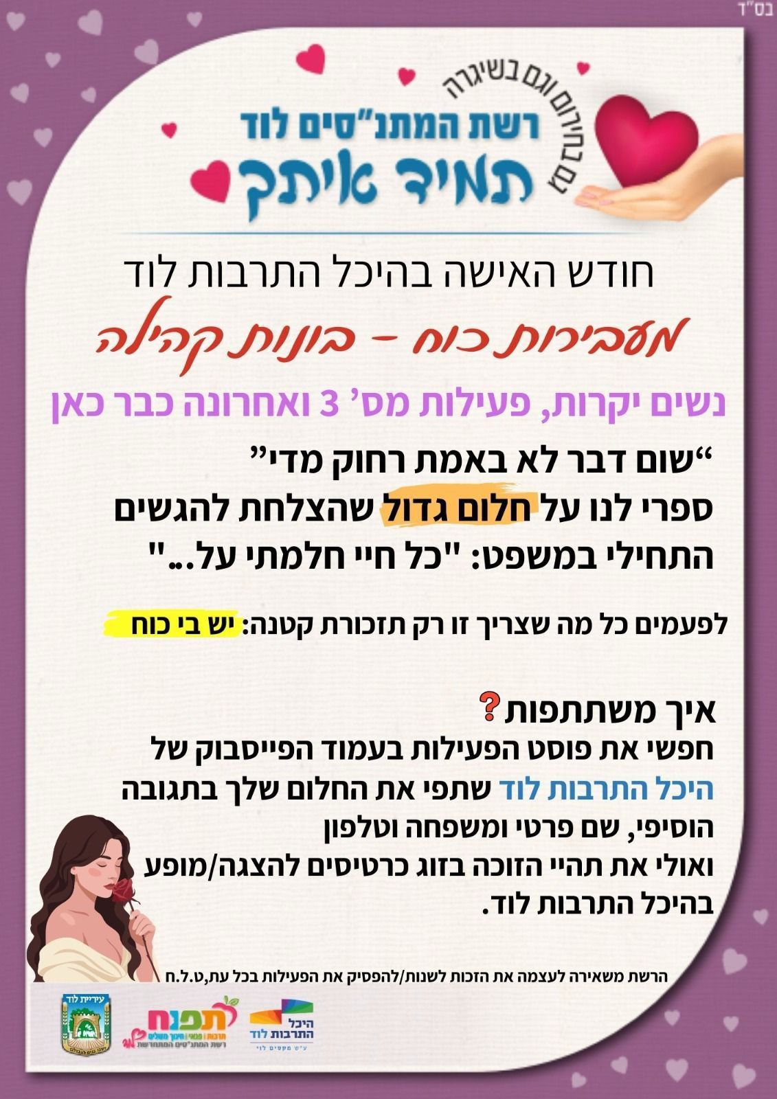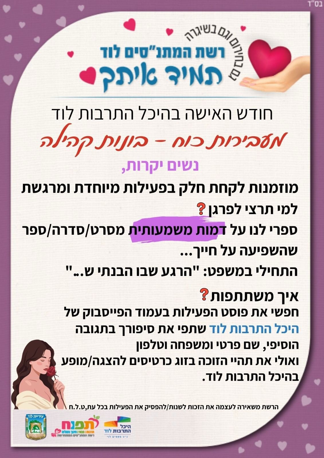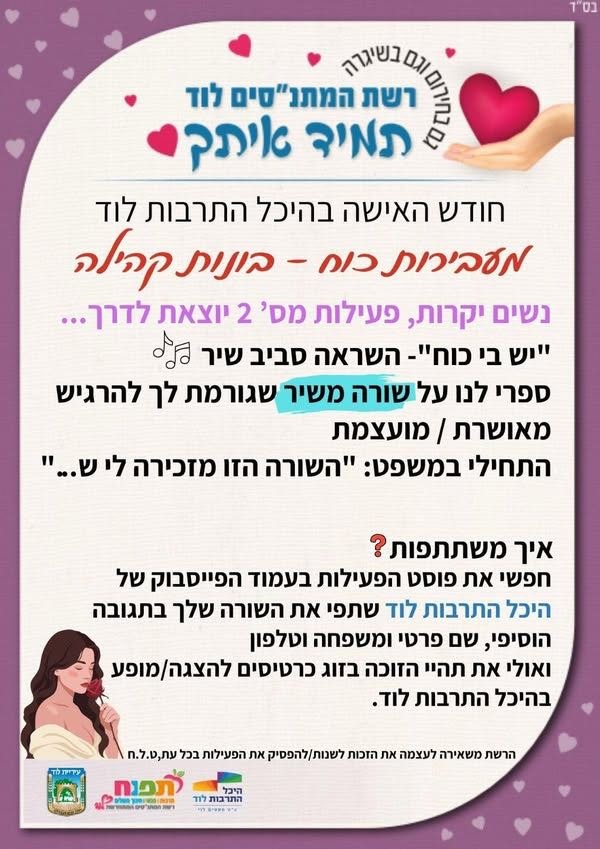 > היכנסי לפוסט הפעילות בעמוד הפייסבוק של היכל התרבות לוד המצורף בתחתית הפוסט
