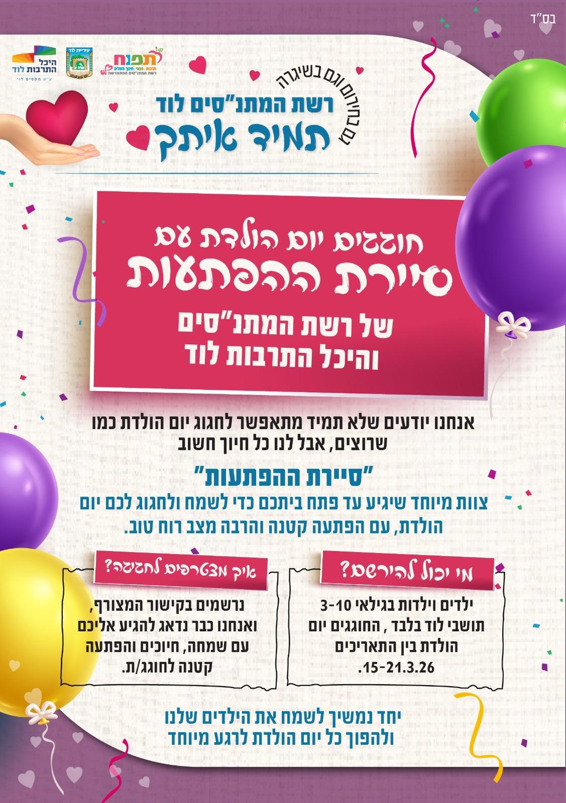 ילדים וילדות תושבי לוד בגילאי 3–10 שחוגגים יום הולדת בין 15-21.3.26.