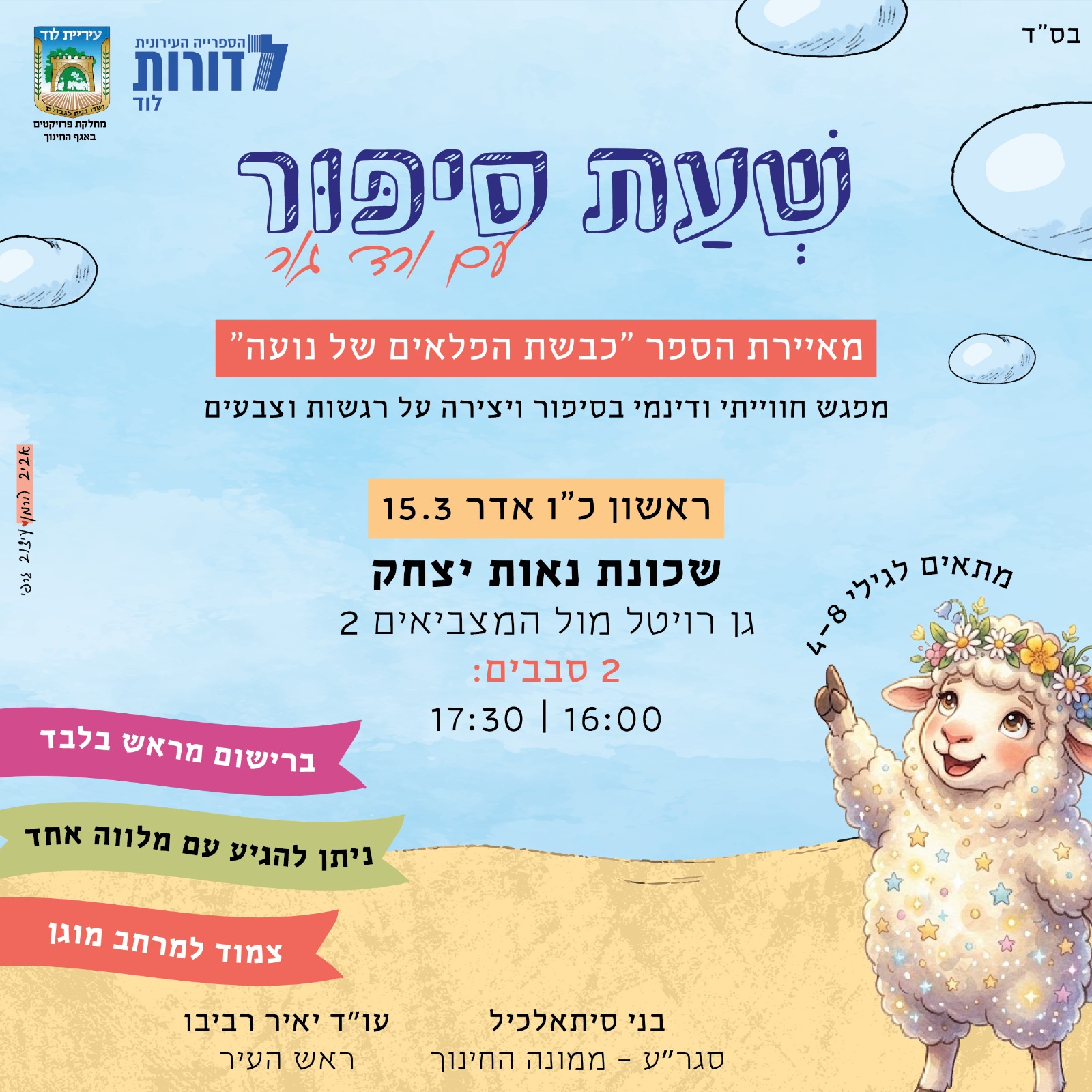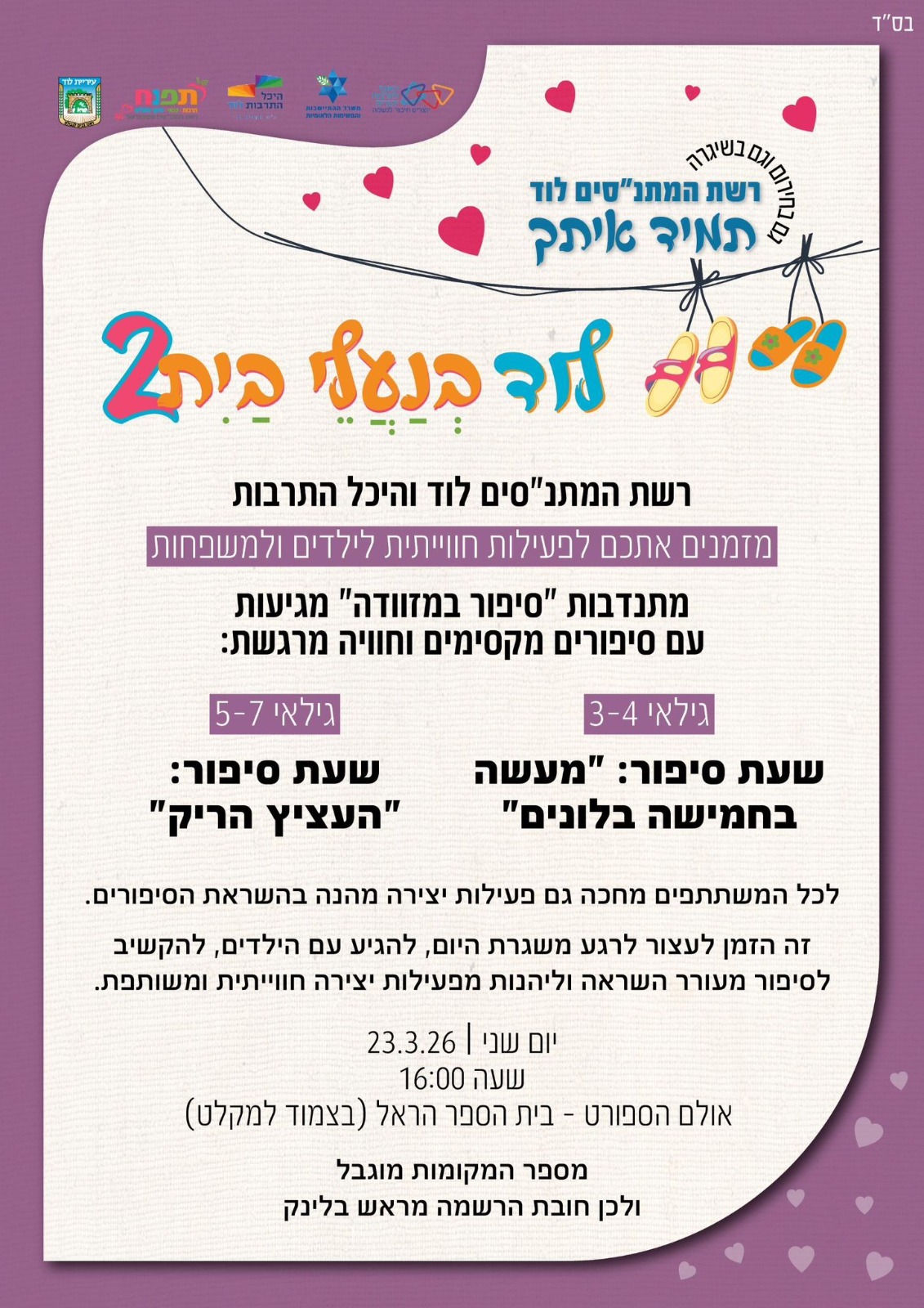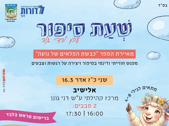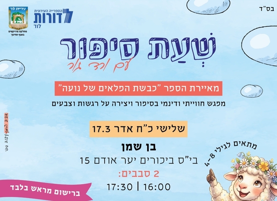 במסגרת "לוד בנעלי בית" רשת המתנ״סים, היכל התרבות ואגף התרבות בעיריית לוד מזמינים אתכם ילדים וילדות למפגש עם מתנדבות "סיפור במזוודה"- שעות סיפור מקסימות בשילוב יצירה בנושא הסיפור וחוויה מהנה: