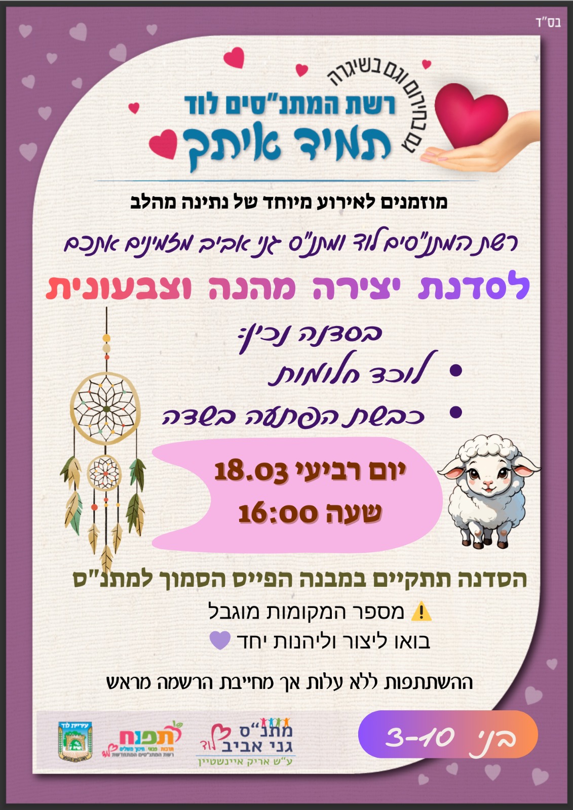 רשת המתנ"סים לוד ומתנ"ס גני אביב מזמינים אתכם לסדנת יצירה מהנה וצבעונית!