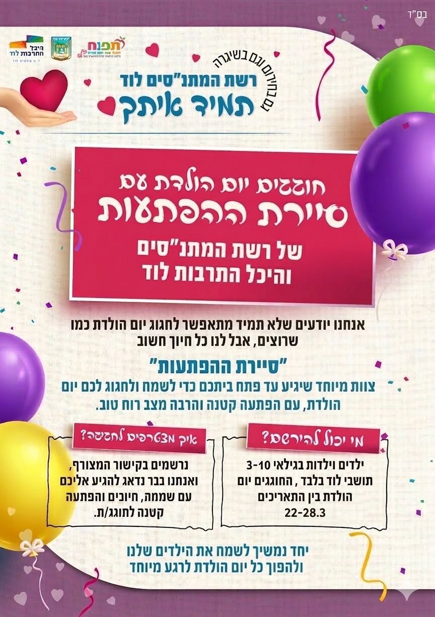 ילדים וילדות תושבי לוד בגילי 3-10 שחוגגים יום הולדת בין 22-28.3.26.