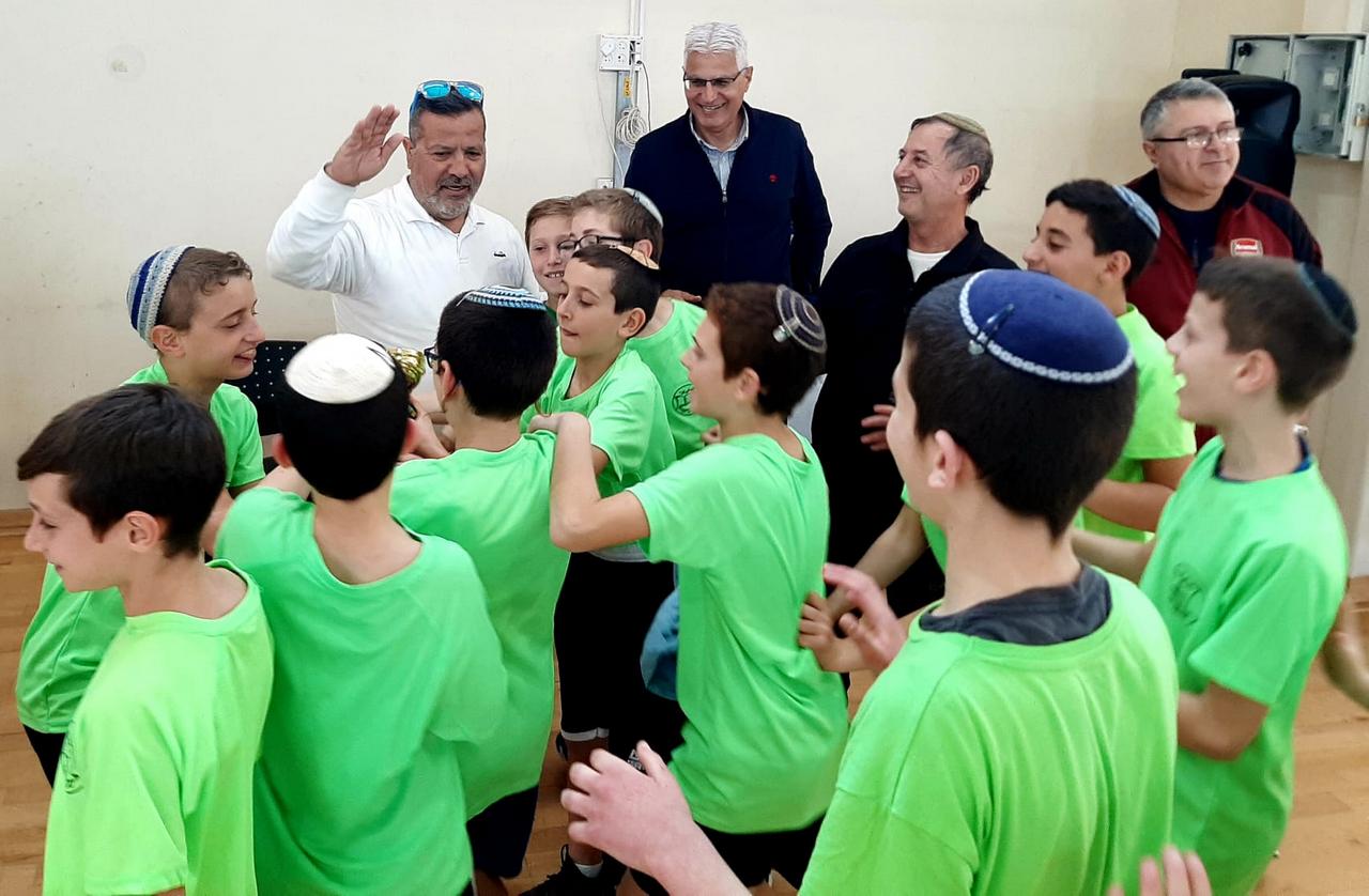 • לקראת טקס חלוקת הגביעים, אריה לוי ומאיר אליהו עם האלופים שבדרך