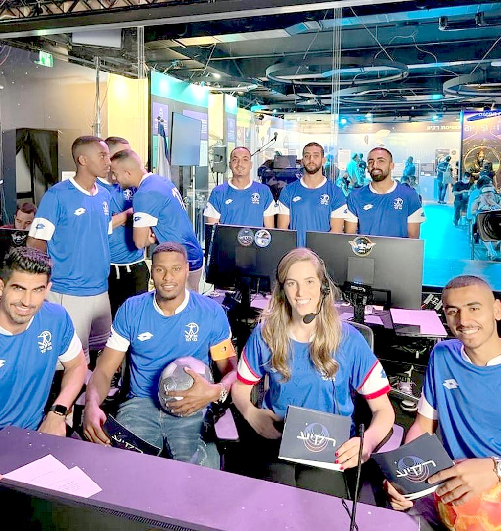 - נועה קלגסבלד וקבוצת השחקנים של הפועל בני לוד, במהלך שיחה עם האסטרונאוט איתן סטיבה