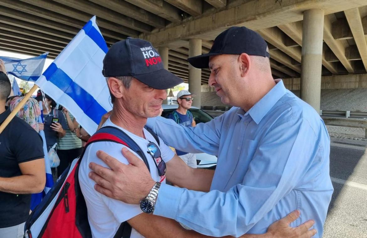 חיבוק תומך. רביבו עם אנשי משפחות החטופים - בצעדה בדרכם לירושלים.jpe
