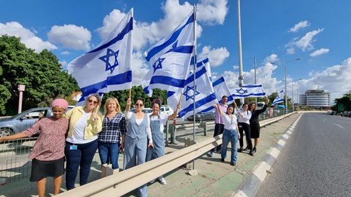 עובדי עיריית לוד מניפים את דגל ישראל בגאווה לרומם את הרוח בצעדה.jpe
