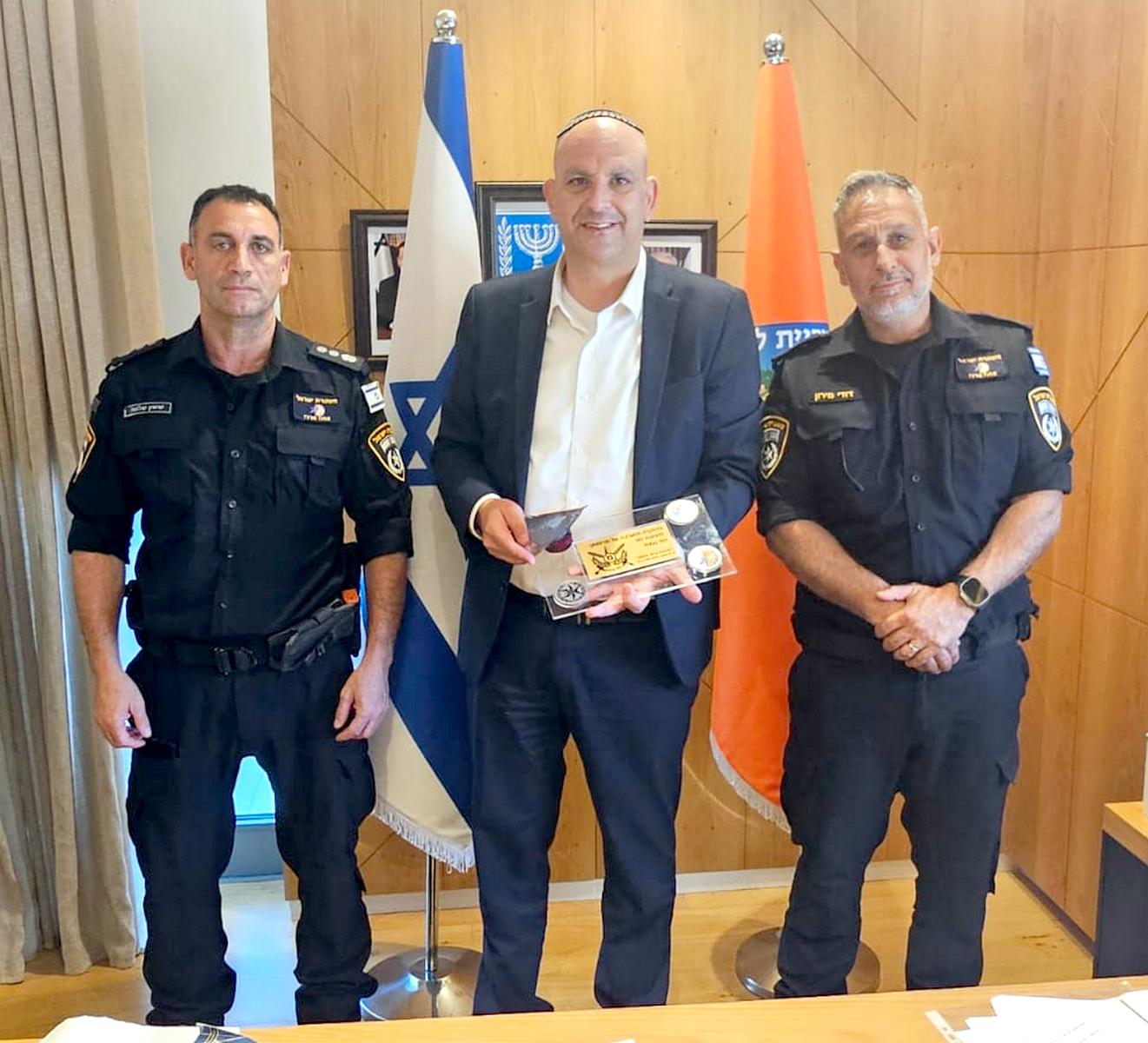 ראש העיר עם המפקד הנכנס והמפקד היוצא בלשכתו השבוע.jpe