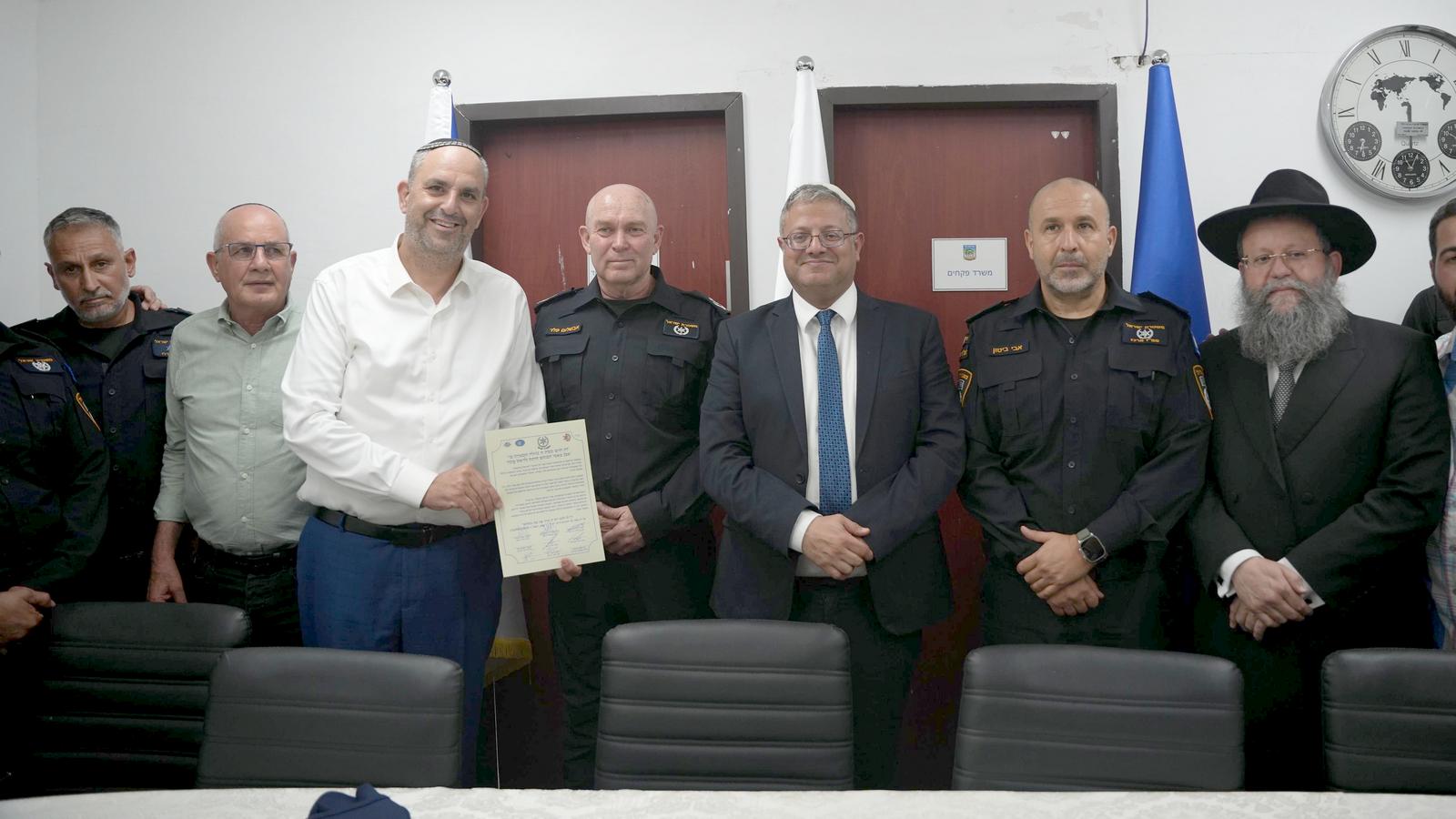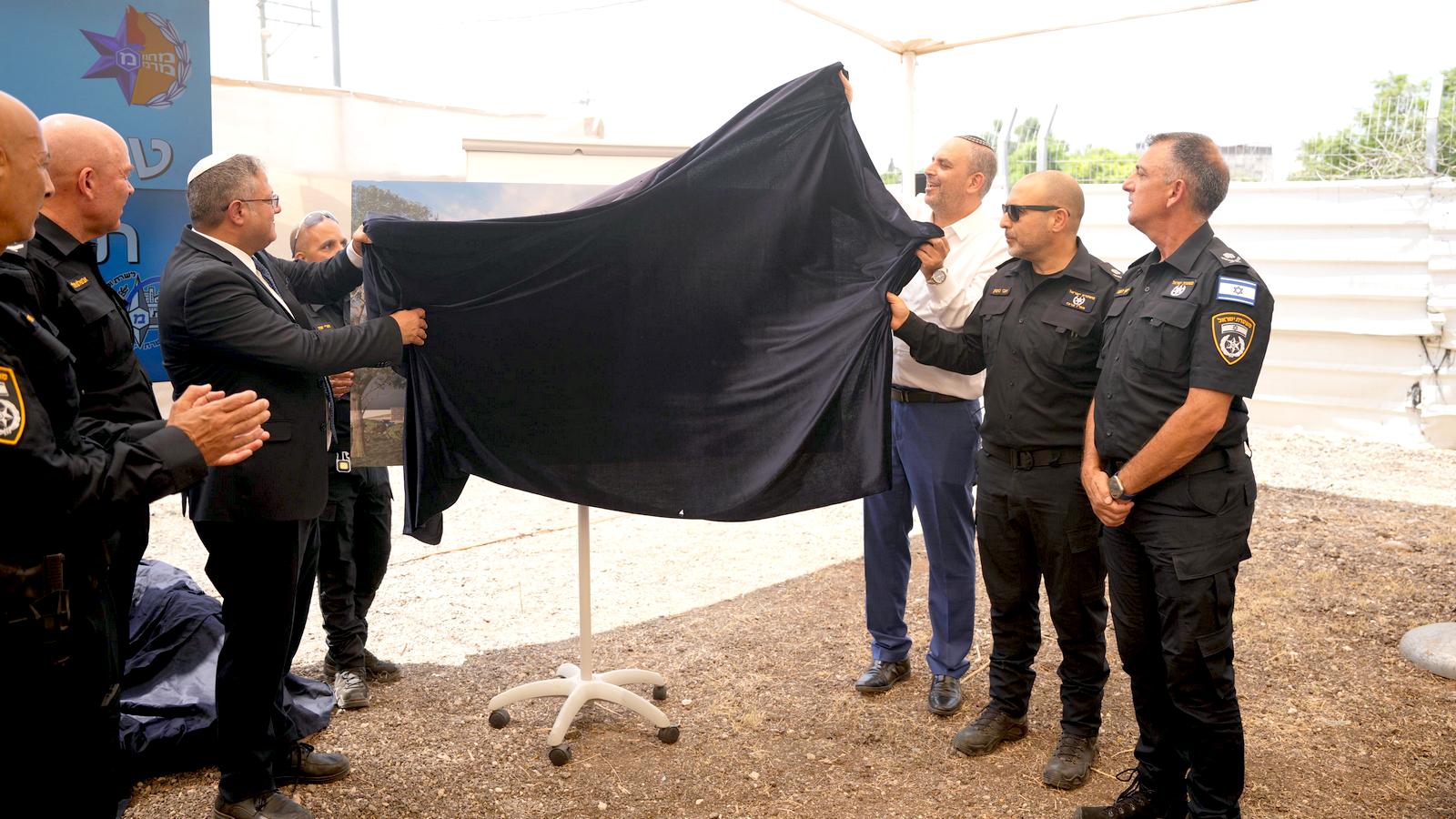 ראש העיר והשר לביטחון לאומי מסירים את הלוט בטקס הנחת אבן פינה לתחנת משטרה חדשה בלוד