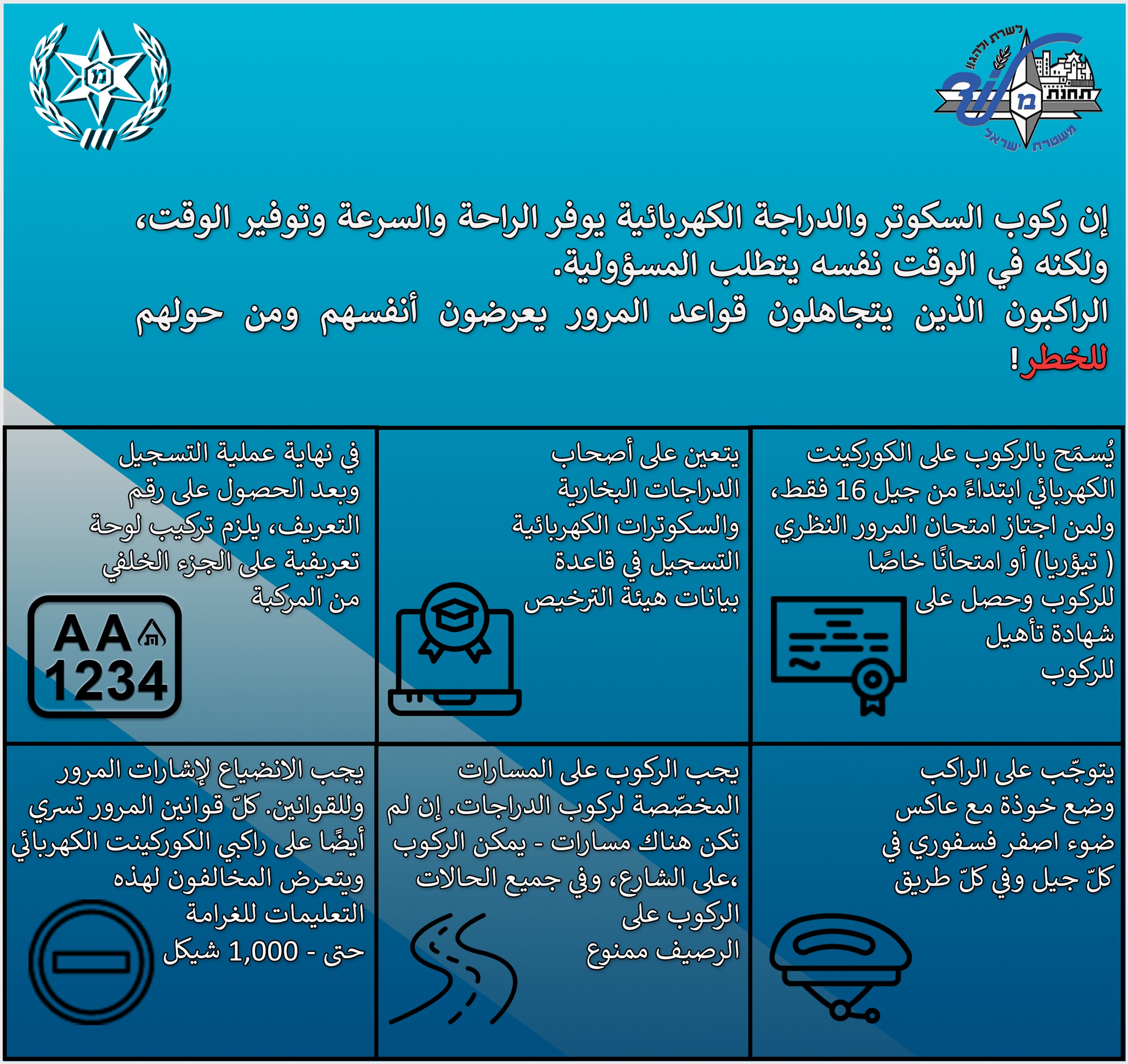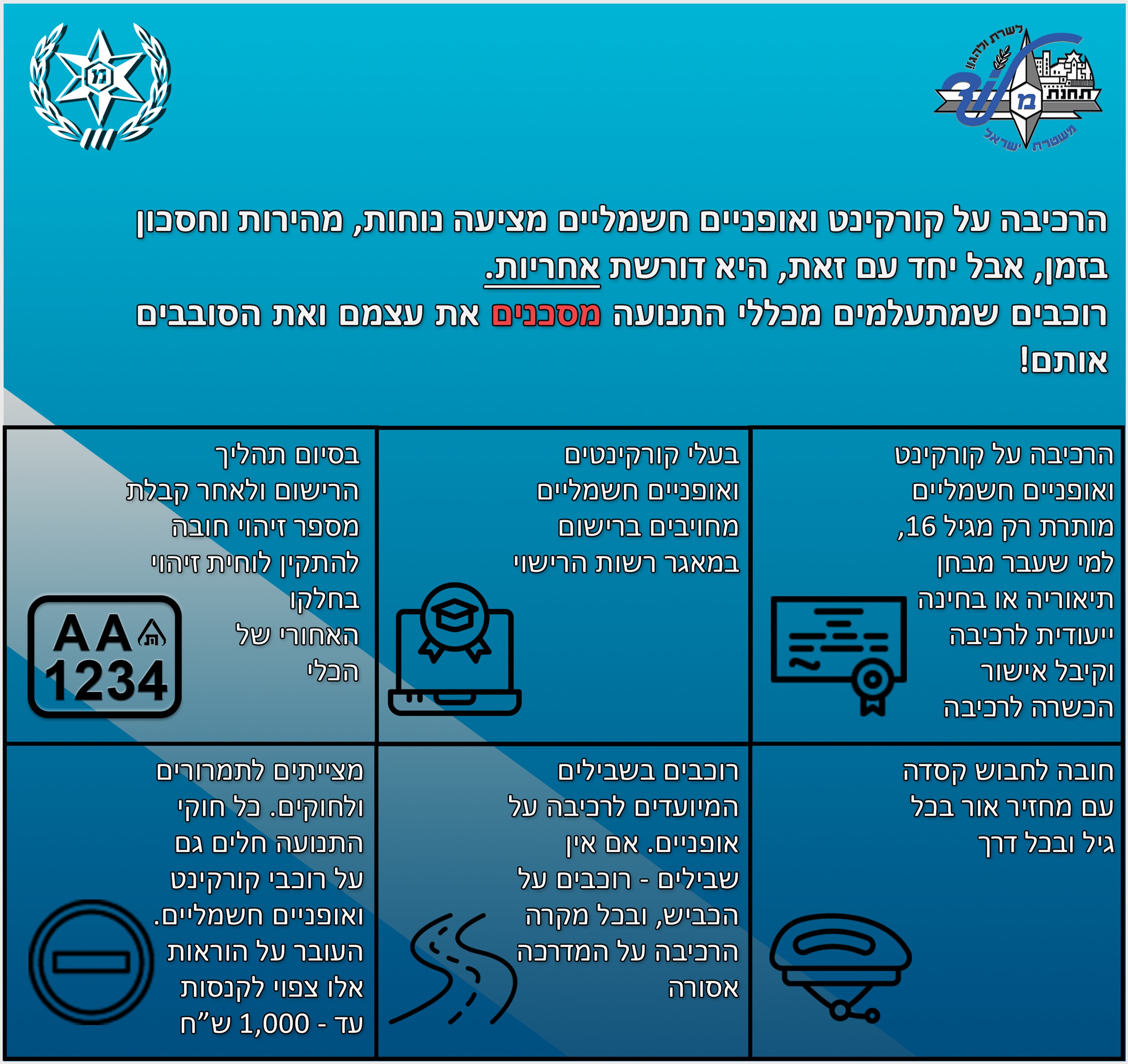 רישיון נהיגה: על נהגי האופניים והקורקינטים החשמליים להחזיק ברישיון נהיגה בתוקף או לעבור מבחן תאוריה.
