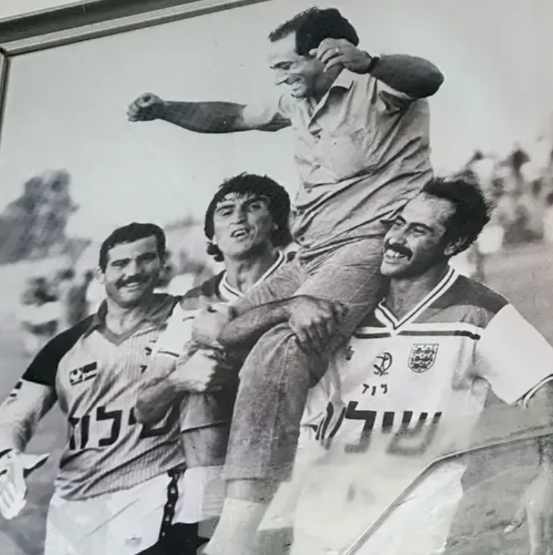 יצליחו לשחזר את הזכייה בגביע. שחקני קבוצת הפועל לוד המיתולוגית נושאים על כפיים את בני רגב זל לאחר הז