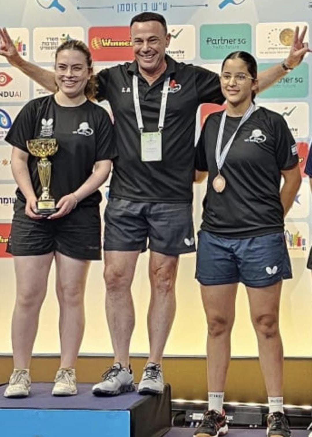 השחקניות יהודית ברונשטיין ואלישבע גבריאלוב עם המאמן הראשי איציק אברמוביץ