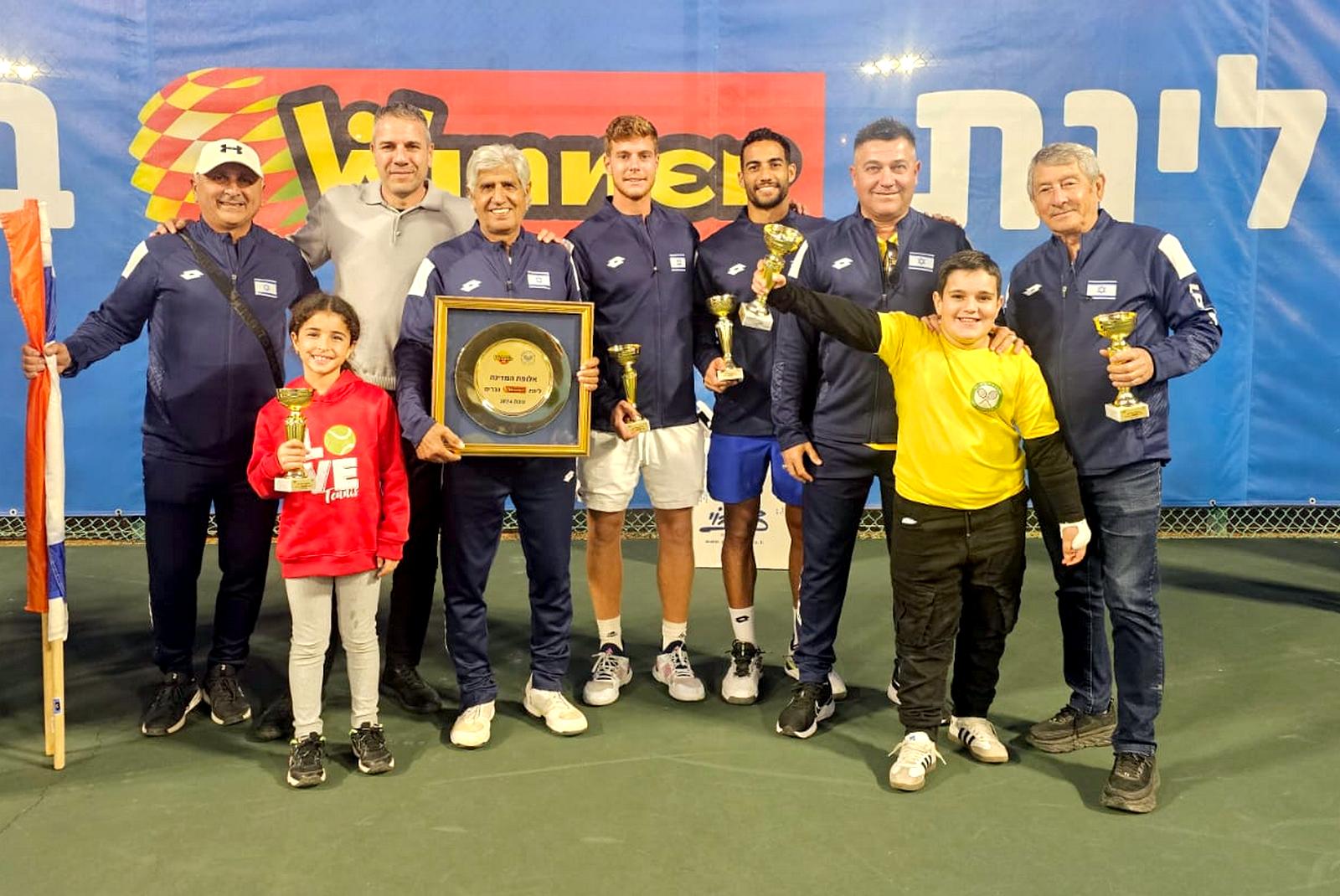 שחקני הקבוצה והמאמנים עם הגביע וצלחת האליפות. התמונה באדיבות איגוד הטניס