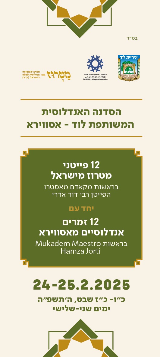 עיריית לוד, ומטרוז – המרכז למוזיקה אנדלוסית ופיוט בישראל, בתמיכת המשרד לשיתוף פעולה אזורי, מקיימים את "הסדנה האנדלוסית המשותפת לוד-אסווירא" – אירוע תרבותי יוצא דופן, המפגיש על במה אחת 12 פייטנים מובילים מישראל לצד 12 זמרים אנדלוסיים ממרוקו. הסדנה, שתתקיים לראשונה בישראל, היא המשך לשיתוף פעולה מוזיקלי מוצלח שהתקיים בשנה שעברה בפסטיבל אטלנטיק אנדלוסי באסווירא, מרוקו.