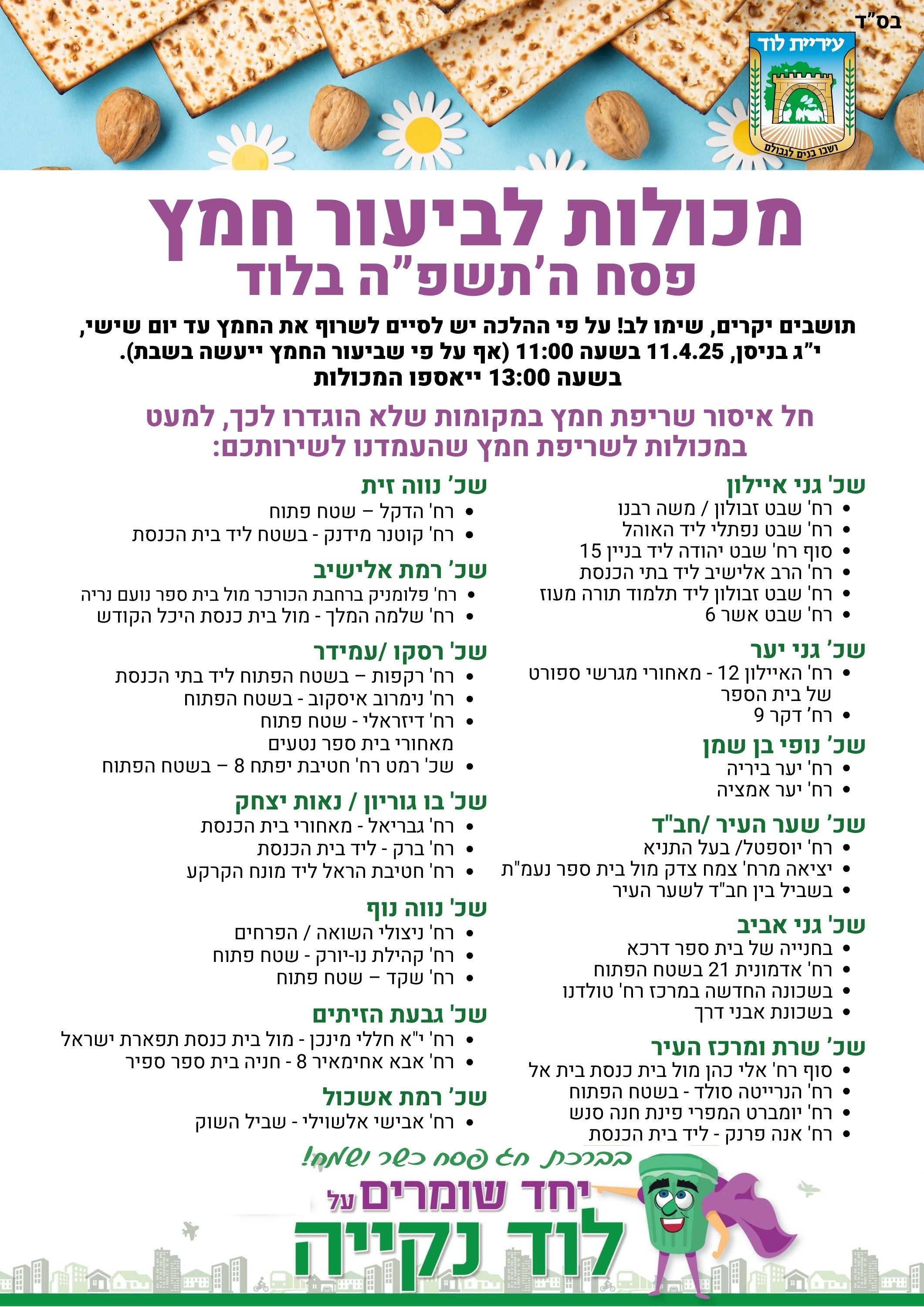 לנוחיותכם, מצ"ב רשימת מקומות של מכולות לשריפת חמץ שהעמדנו לשירותכם ברחבי העיר. יחד נשמור על לוד נקייה!