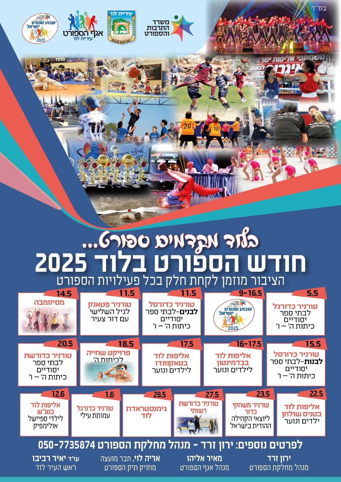 העיר לוד מזמינה את כולם – תושבים מכל הגילים, תלמידים, הורים, שוחרי ספורט ואוהבי חיים – לקחת חלק באירועים, להתרגש, להתחרות, לעודד ולהיות חלק ממשהו גדול באמת. כולם מוזמנים לקחת חלק, ליהנות מהאווירה ולשאוב השראה מהספורט. הכינו את נעלי הספורט ותנו קפיצה למגרש, כי גם חודש מאי הקרב יהיה חגיגה של ספורט בלוד!