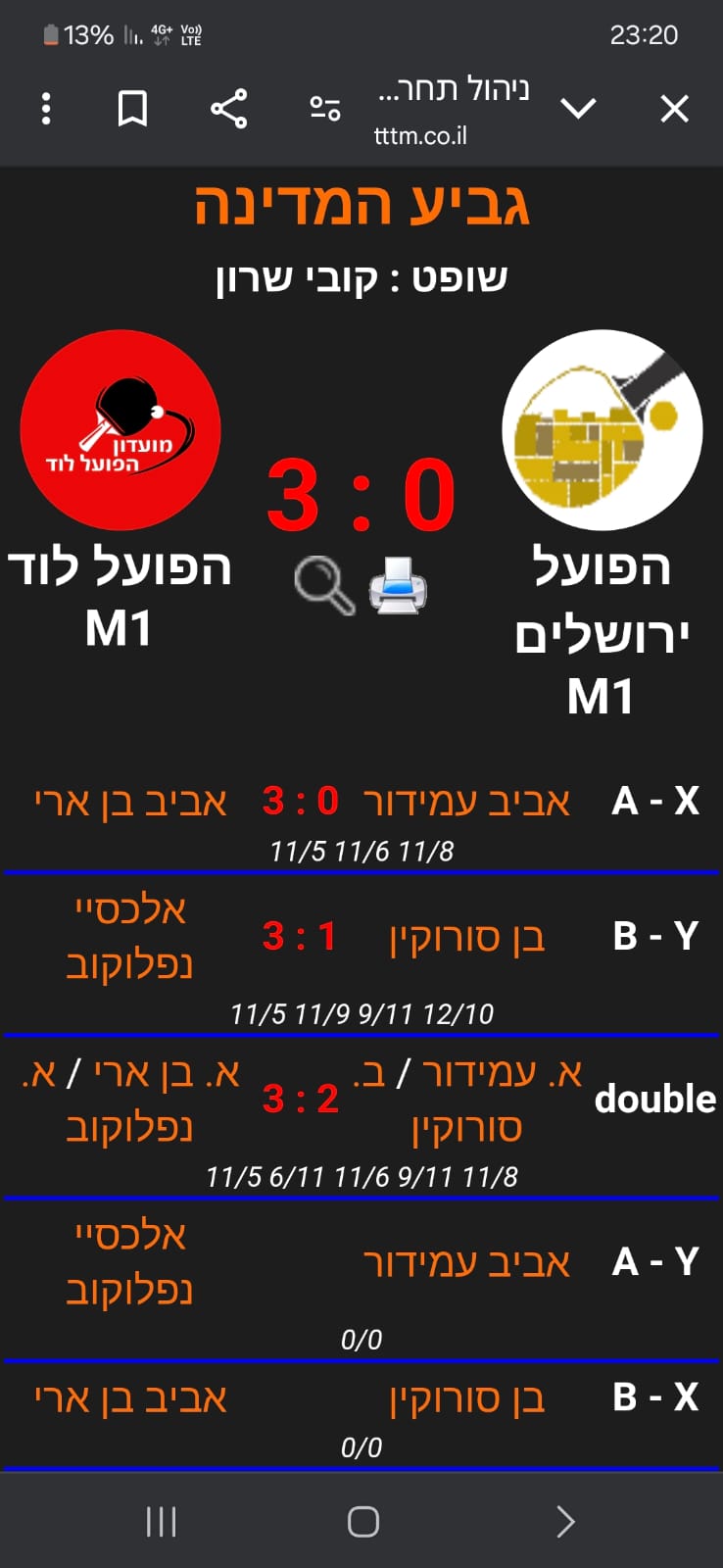 במשחק הזוגות, השניים חברו יחד לקרב צמוד ומרתק. אביב בן ארי ואלכסיי נפולקוב התמודדו מול יריבים עיקשים אך בסופו של דבר השיגו ניצחון 3-2, שקבע את התוצאה הסופית של 3-0 לזכות לוד – ניצחון חלק וחשוב מאוד עבור המועדון.