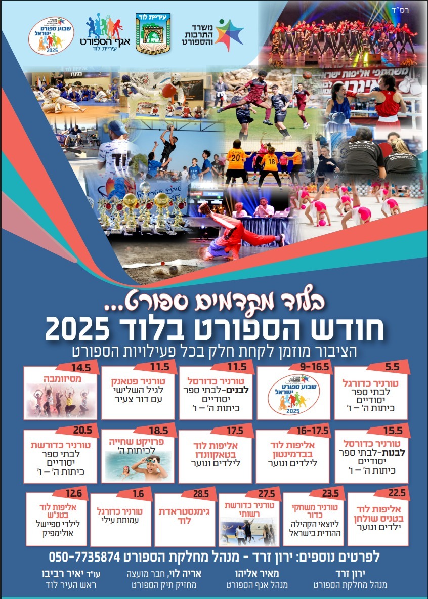 חודש הספורט בלוד הוא הזמנה פתוחה לכל תושבת ותושב: תלמידים, הורים, סבים וסבתות, חובבי תחרויות או סתם מחפשי השראה. זו לא רק הזדמנות להזיז את הגוף – זו הזדמנות להרגיש חלק ממשהו גדול, מאחד, ומרגש. אז הכינו את נעלי הספורט, בואו לקחת חלק. לוד חוגגת ספורט – ואתם חלק מהחגיגה.