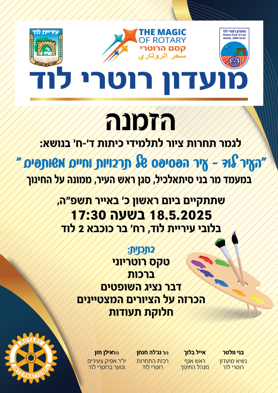 תושבים יקרים, מועדון רוטרי לוד מתכבד להזמינכם לגמר תחרות ציור לתלמידי כיתות ד'-ח' בנושא: "העיר לוד- עיר הפסיפס של תרבויות וחיים משותפים".