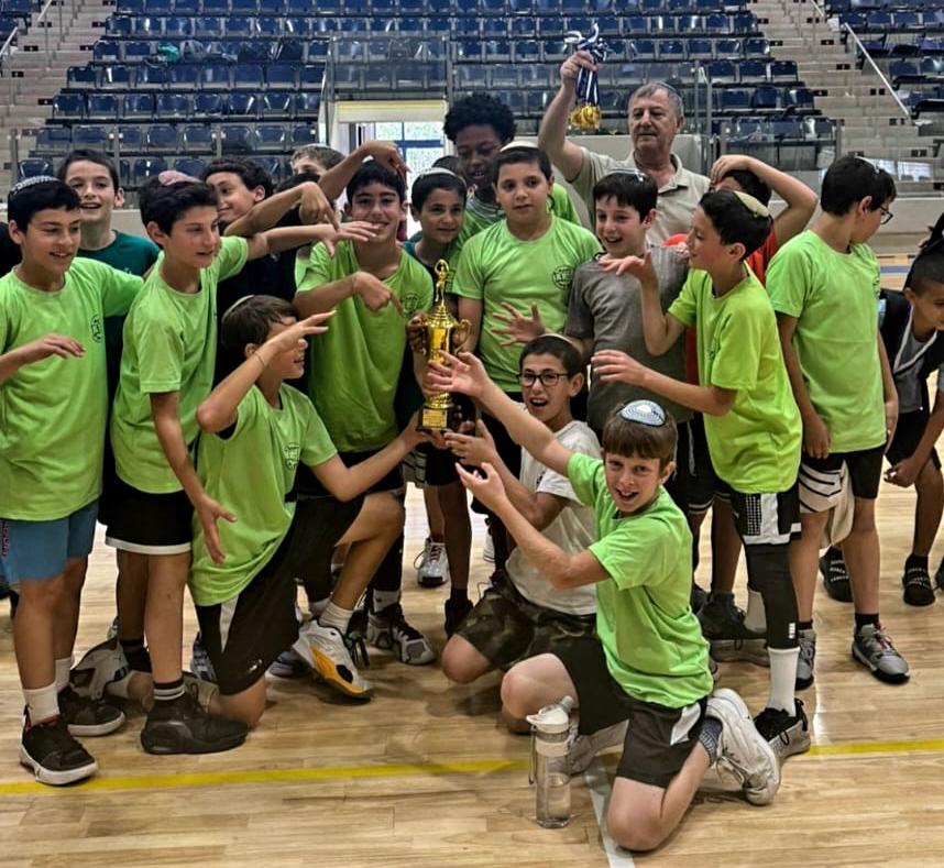 קבוצת בית הספר נועם נריה, הזוכה בטורניר הכדורסל, מניפה את הגביע עם יורי, המורה לחנג