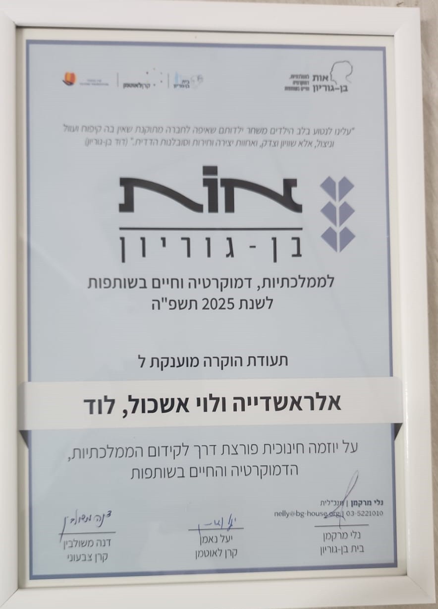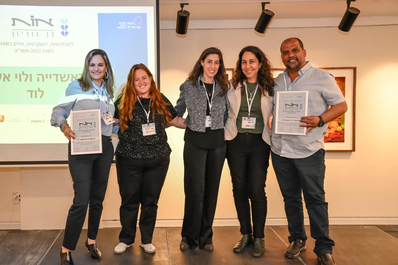 בטקס מרשים שהוסיף כבוד רב לחינוך בלוד, הוענק אות בן גוריון לממלכתיות, דמוקרטיה וחיים בשותפות לשני מנהלי בתי ספר מלוד - אמין אל ג'מאל, מנהל בית הספר אל ראשדייה, וגלית גרשום, מנהלת בית הספר לוי אשכול.