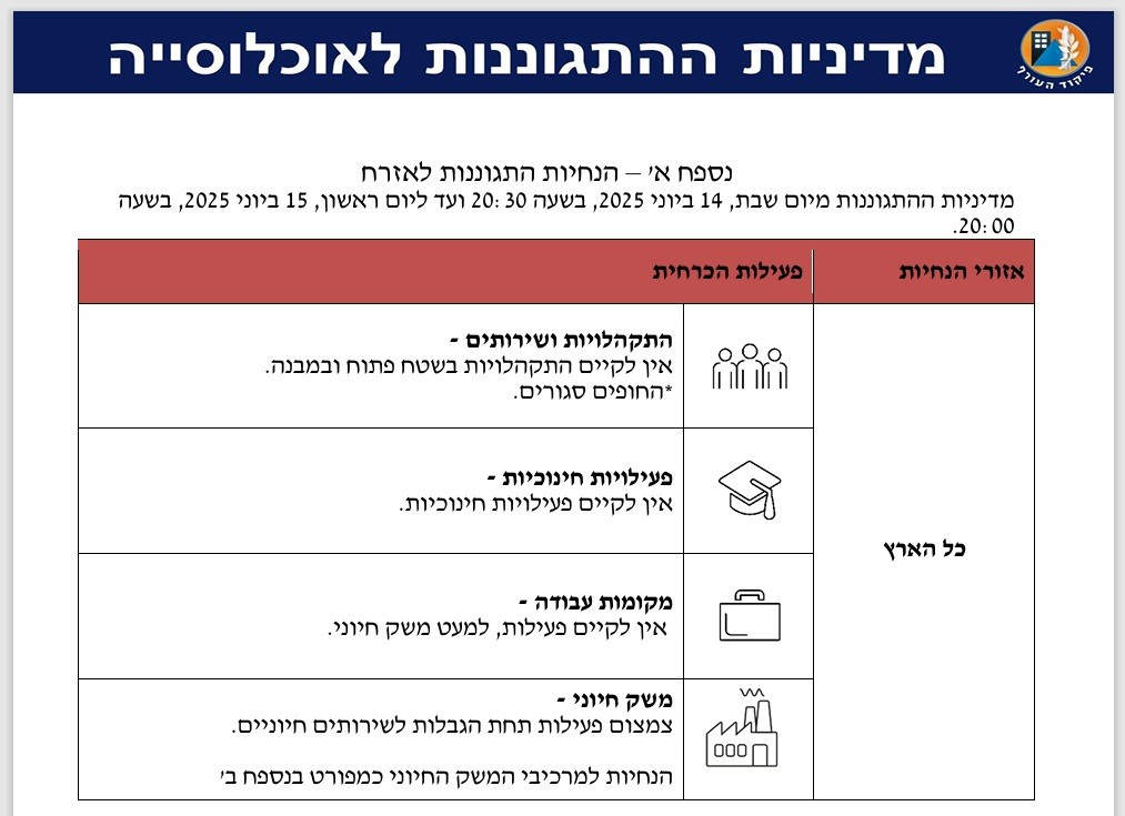 המדיניות בתוקף החל מיום שבת, 14 ביוני 2025, בשעה 20:30 ועד ליום ראשון, 15 ביוני 2025, בשעה 20:00.