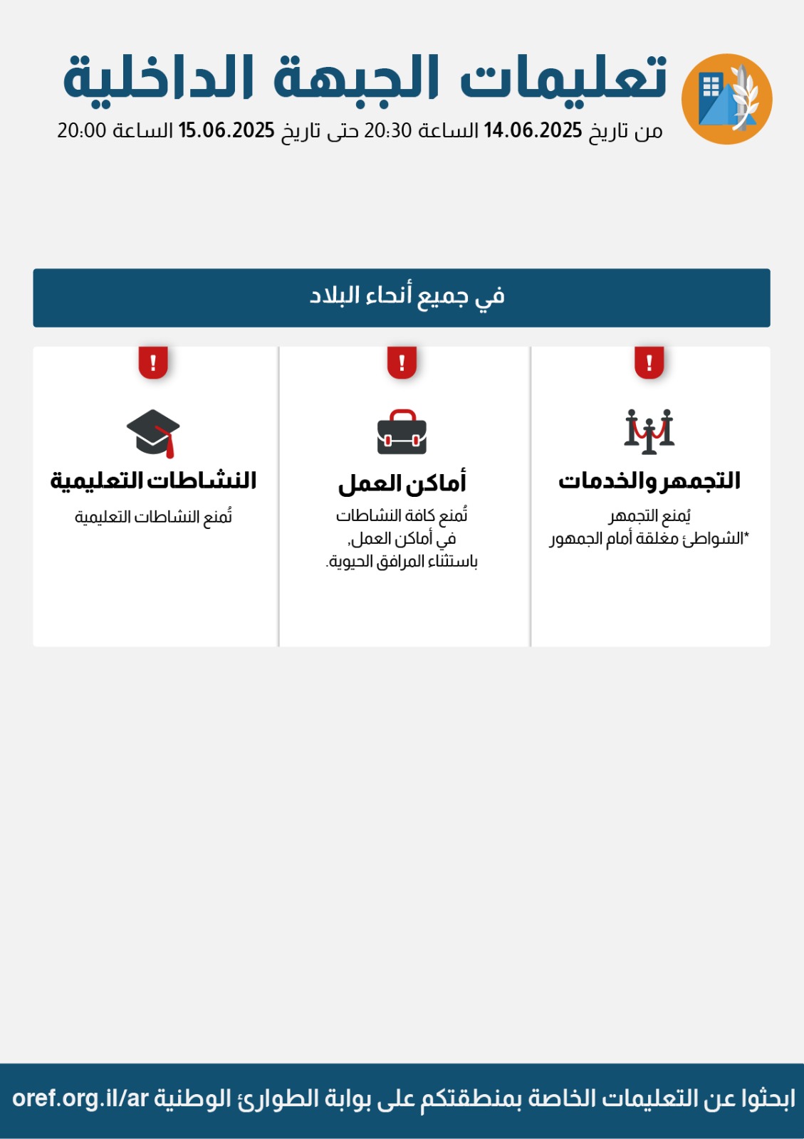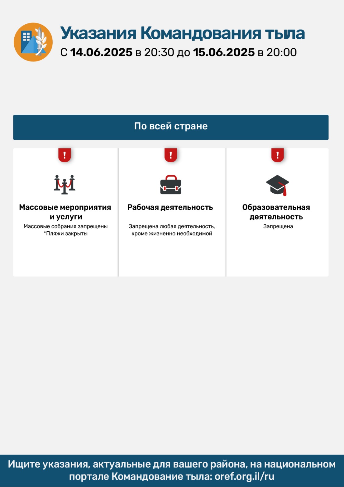 * אין לקיים פעילות חינוכית * אין לקיים התקהלויות בשטח פתוח ובמבנה * אין מקומות עבודה למעט משק חיוני *