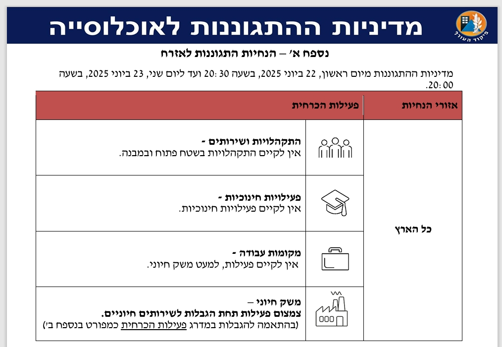 בהתאם לכך, החל מיום ראשון, 22.6.25 ועד יום שני 23.6.25 בשעה 20:00 לא יתקיימו לימודים בכל מוסדות החינוך בעיר, ולא ייפתחו בתי עסק שאינם חיוניים. כמו כן, חל איסור על התקהלות במרחב הציבורי.