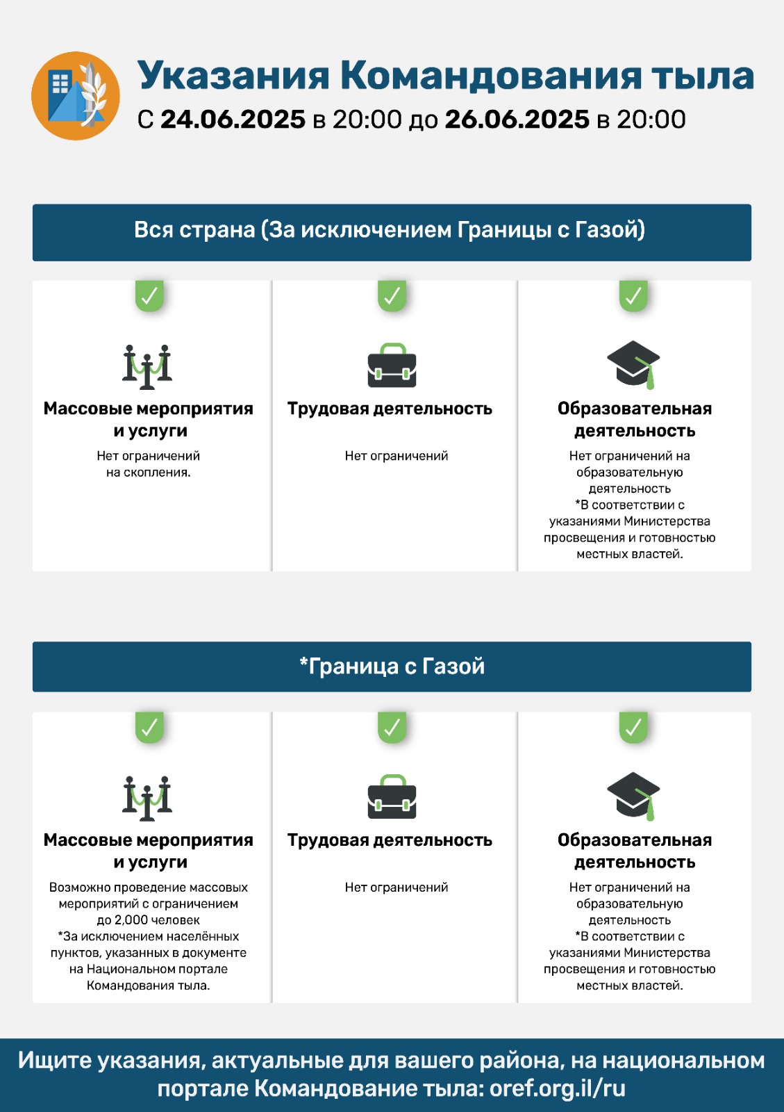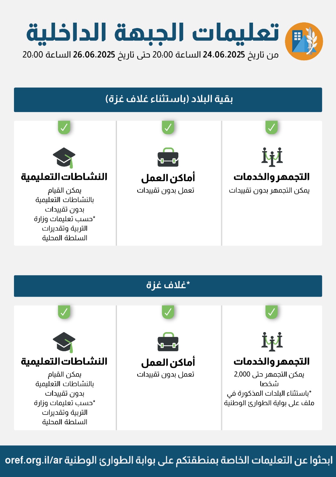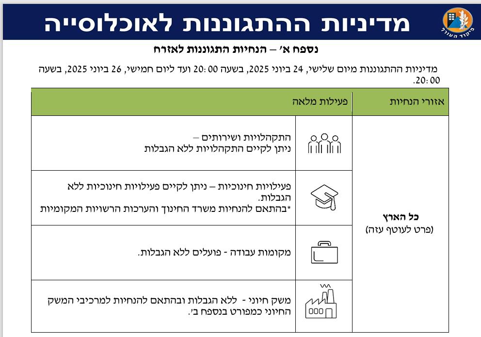 המדיניות בתוקף החל מיום שלישי, 24 ביוני 2025, בשעה 20:00 ועד ליום חמישי, 26 ביוני 2025, בשעה 20:00.