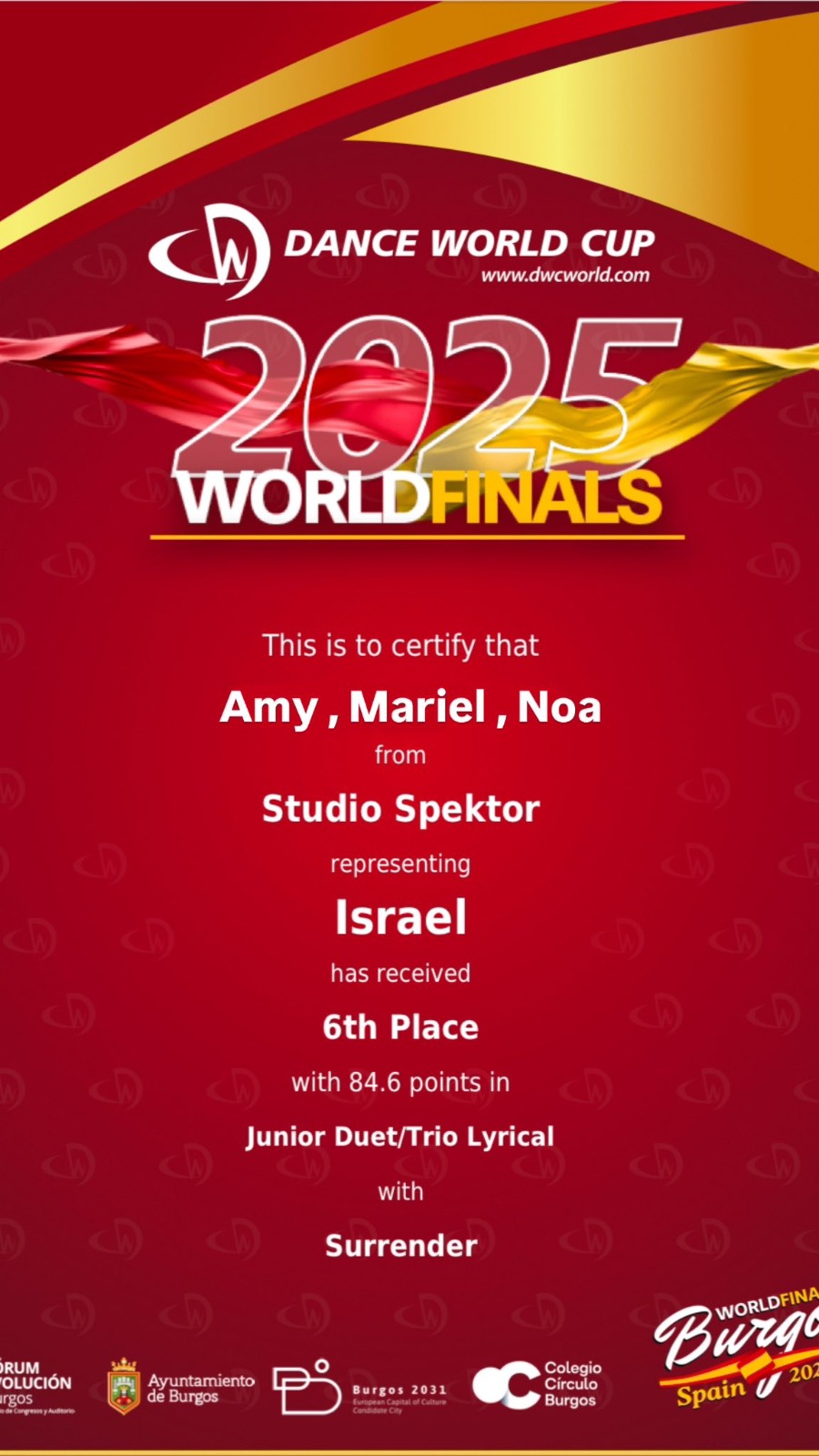 ההישג של הטריו מצטרף לשורת זכיות נוספות של חברי וחברות הנבחרת הישראלית, שייצגו בכבוד את מדינת ישראל ואת העיר לוד. התחרות, שנמשכה עשרה ימים, כללה מעל ל־6,000 מופעים בשלל סגנונות מחול, ונערכה בשלושה אולמות מרכזיים בעיר בורגוס, שהוכרזה השנה כבירת המחול העולמית.