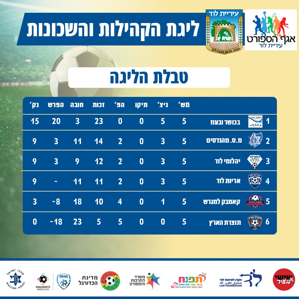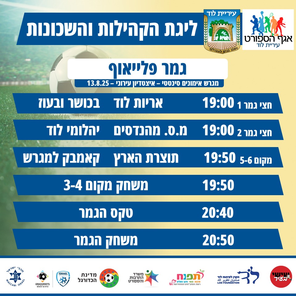 לאחר חמישה מחזורים מרתקים, ליגת השכונות והקהילות בכדורגל בלוד הגיעה לשלב המכריע: חצי גמר הפלייאוף ומשחק הגמר התקיימו ביום רביעי האחרון, לאחר סגירת הגיליון. את תוצאות המשחקים ואת זהות אלופת הטורניר וסגניותיה נפרסם בגיליון הבא.