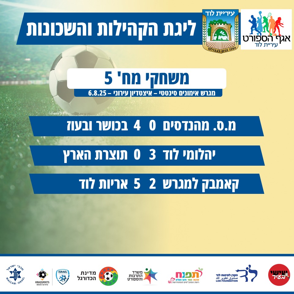 ליגת השכונות והקהילות של לוד נערכת לראשונה הקיץ, לאחר שנים ארוכות ללא טורניר שכונות בעיר. מדובר ביוזמה מבורכת של אגף הספורט בעיריית לוד, בשיתוף ארגון "מדינת הכדורגל", שמטרתה לחבר בין קהילות העיר, לעודד ספורט עממי וליצור מסורת חדשה של תחרות הוגנת, גיבוש ואווירה ספורטיבית.