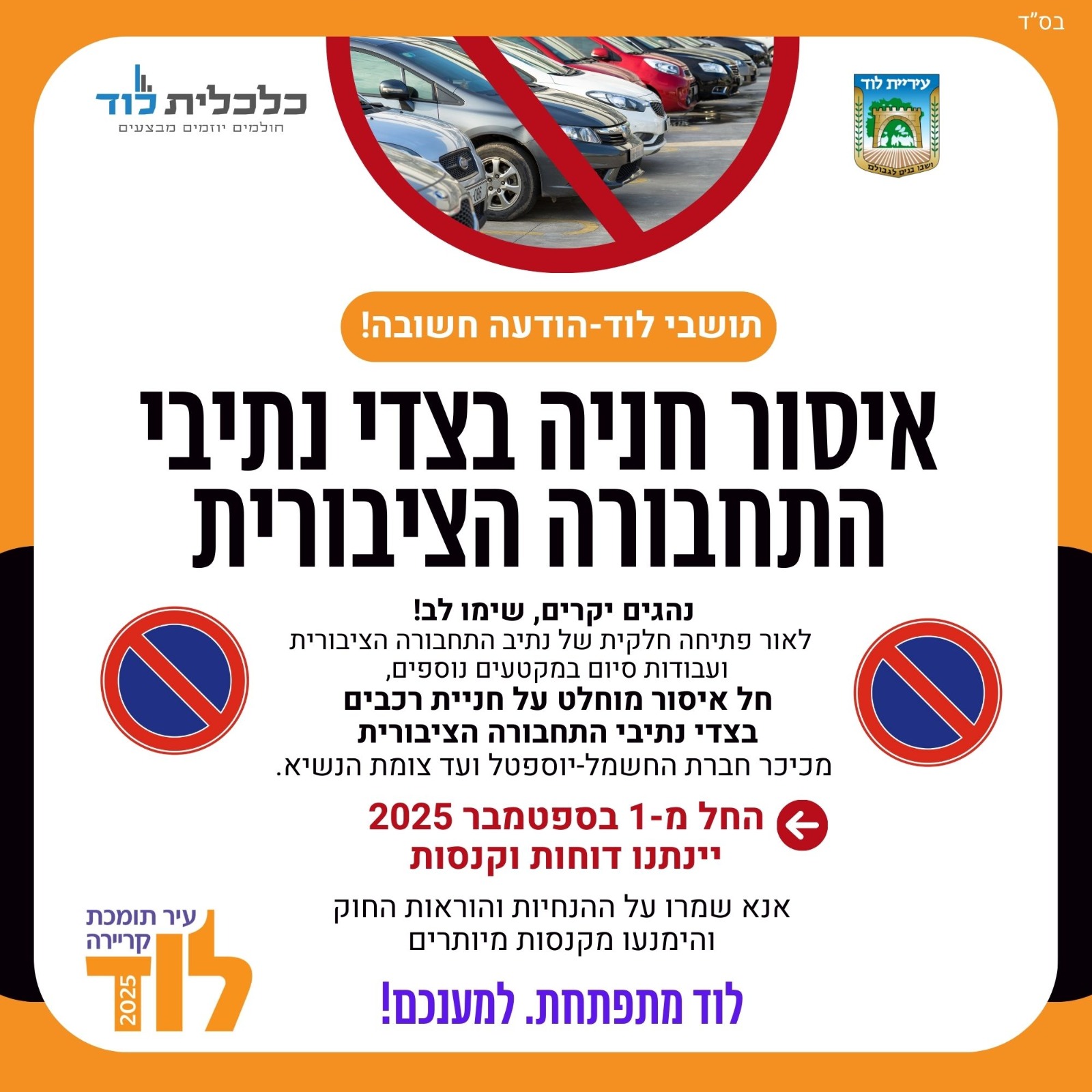 תושבי לוד, שימו החנייה בצדי נתיב תחבורה ציבורית אסורה בהחלט! החל מה-1 בספטמבר 2025, דוחות וקנסות יינתנו כחוק למפרי ההנחיות, אנא, שתפו פעולה!