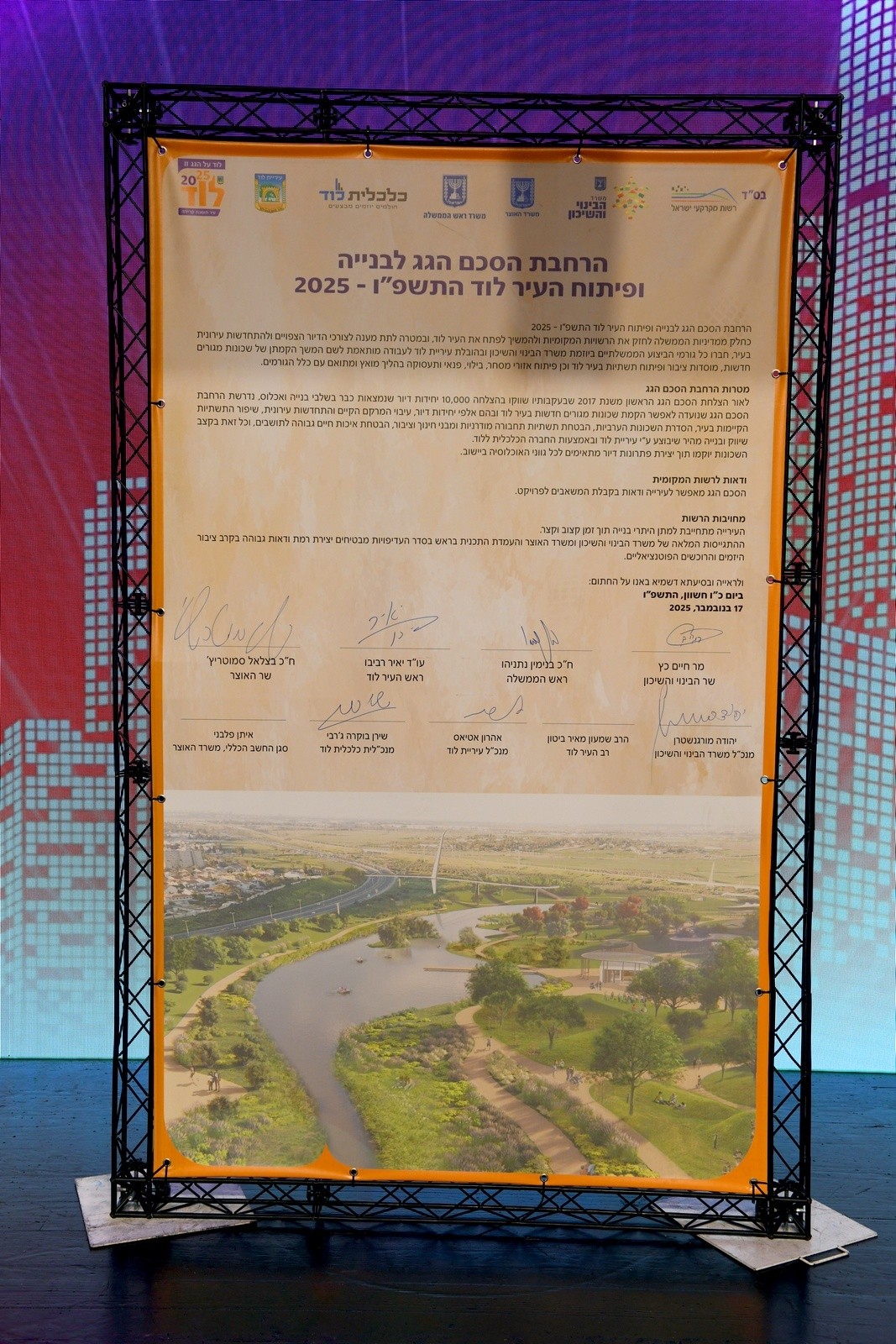לוד על הגג 2: עיריית לוד ומדינת ישראל חתמו על הסכם גג שני - השקעה של 5.8 מיליארד ₪. פני העיר כעת אל המשימה המרכזית של העשור הבא - ההתחדשות העירונית, 21,200 יחידות דיור בהתחדשות עירונית והשקעות אדירות בלב העיר הוותיקה,  6,800 יח"ד בשכונות חדשות, פיתוח LODCATION – אזור העסקים, המסחר והתעסוקה בצפון העיר, הקמת ארנה בינלאומית, הקמת מתחם גולף יוקרתי באזור גינתון, ומשכן לאומנויות הבמה בלב העיר העתיקה ● לוד עושה היסטוריה ומציגה את חזון העתיד של ישראל"