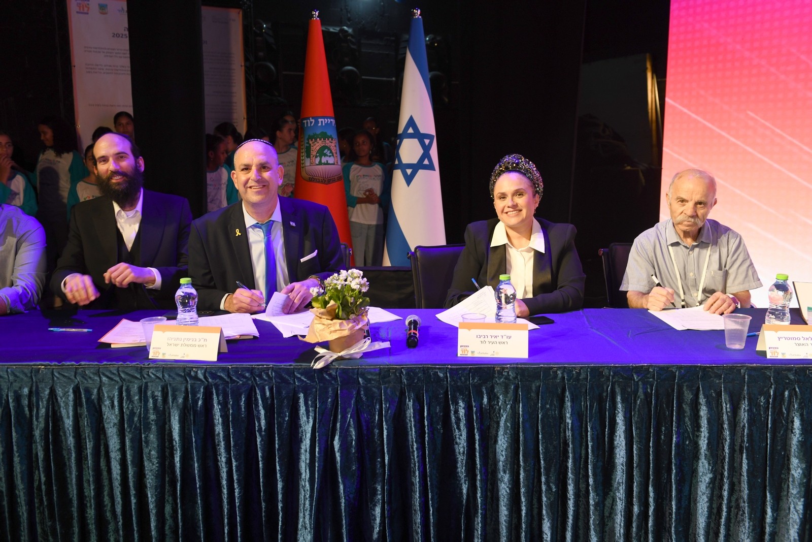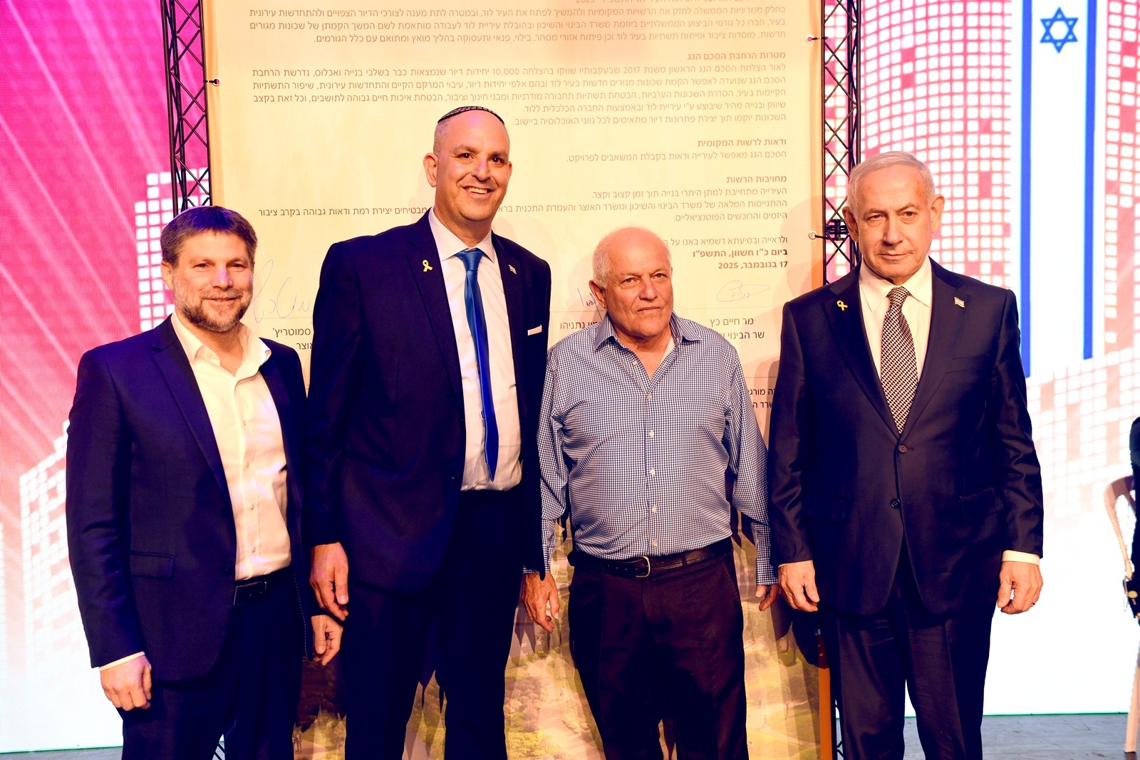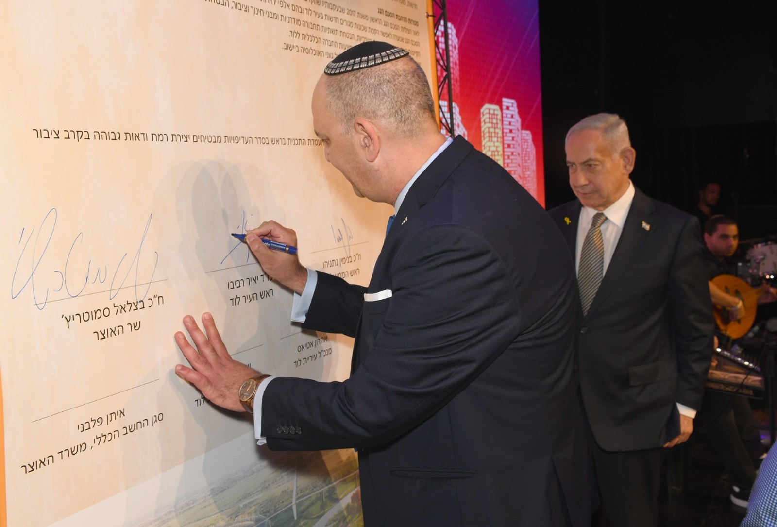 בטקס חגיגי במעמד ראש הממשלה בנימין נתניהו, שר הבינוי והשיכון חיים כץ, שר האוצר בצלאל סמוטריץ', ראש העיר לוד יאיר רביבו, שרים, חברי כנסת וחברי מועצה, חתמה העיר לוד עם מדינת ישראל על הסכם גג שני בהיקף של 5.8 מיליארד ₪ (צילום: מוקי שוורץ)