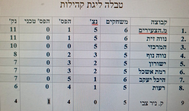 לאחר שישה מחזורים, שלוש קבוצות מובילות את הליגה בצמוד: "מרכז הצעירים" ו"נווה זית" עם חמישה ניצחונות והפסד אחד, ו־11 נקודות כל אחת. "המרכזי" עם חמישה ניצחונות וללא הפסדים, ו־10 נקודות בלבד בשל משחק חסר. מאחוריהן, קבוצות כמו "רמת אשכול" ו"ישורון" ממשיכות להיאבק על מקומן בפלייאוף.