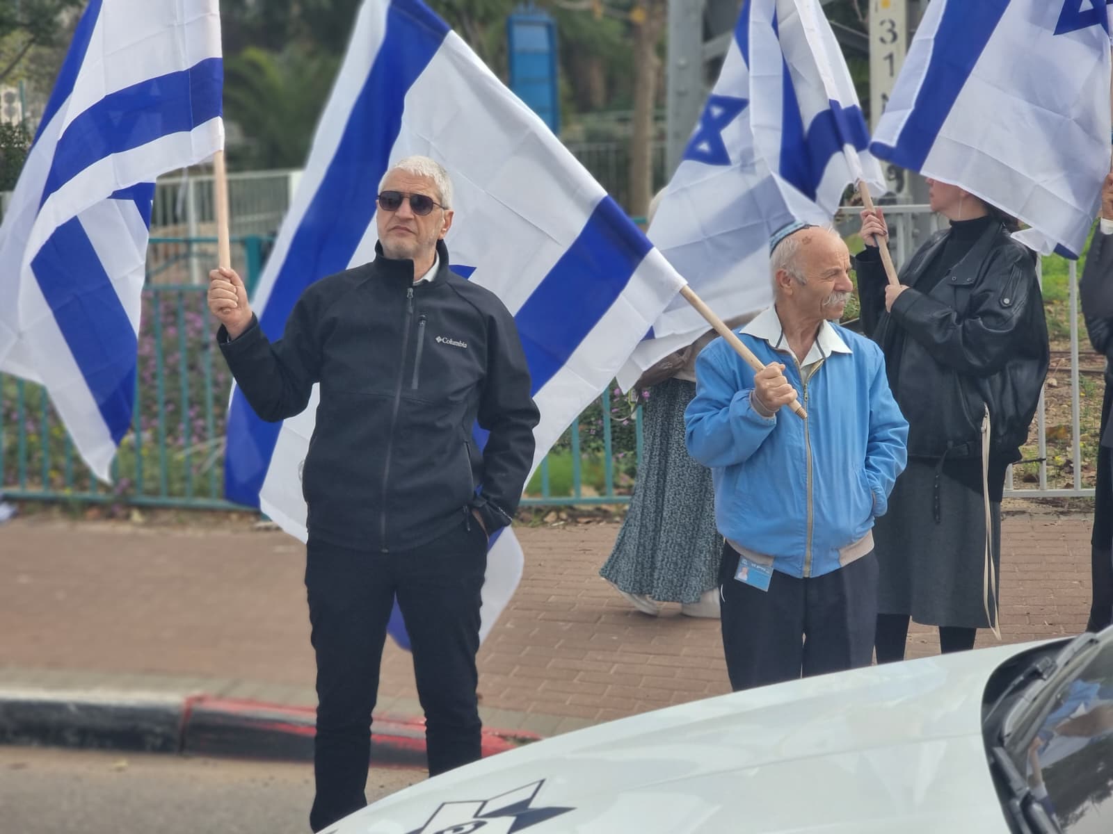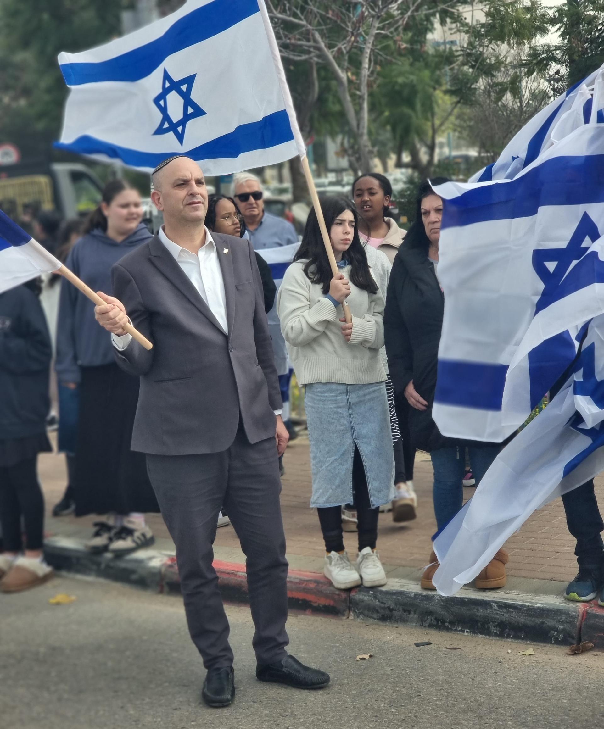 ראש העיר יאיר רביבו מנפנף בדגל ישראל לכבודו של החטוף האחרון.jpe